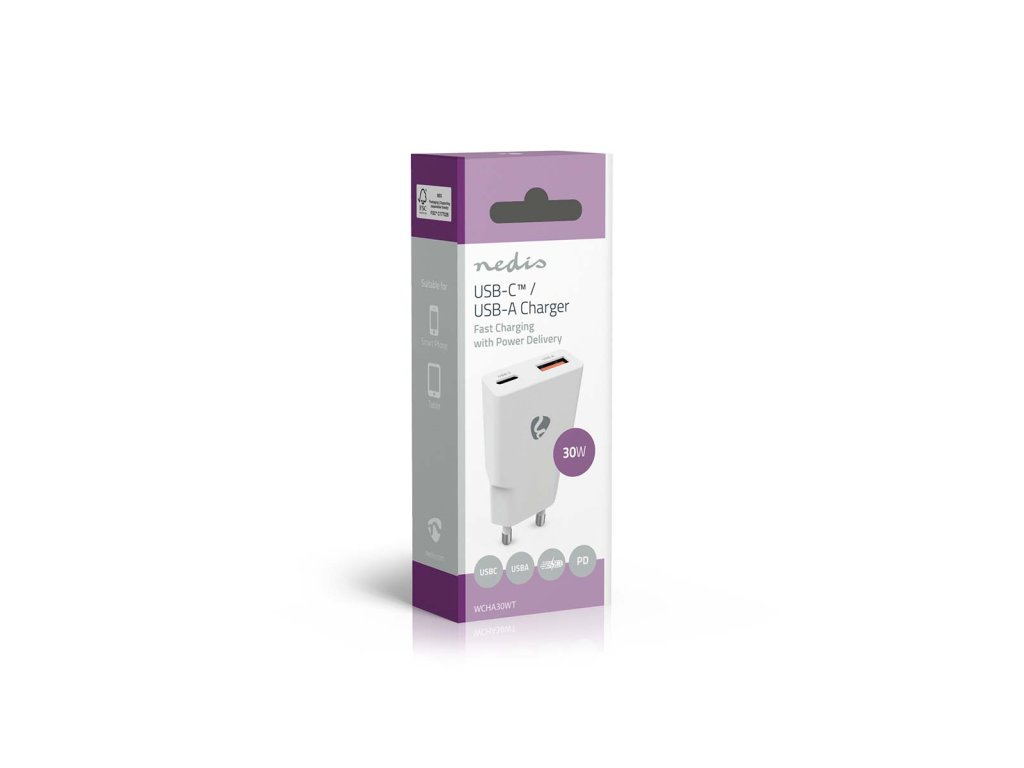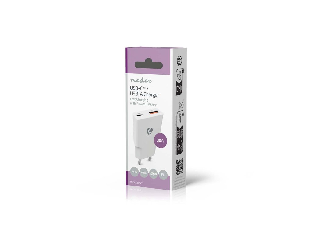 Nedis 30W GaN rychlý USB nabíjecí adaptér, USB-C, 3A, PD Power Delivery, automatická volba napětí, bílá (WCHA30WT)