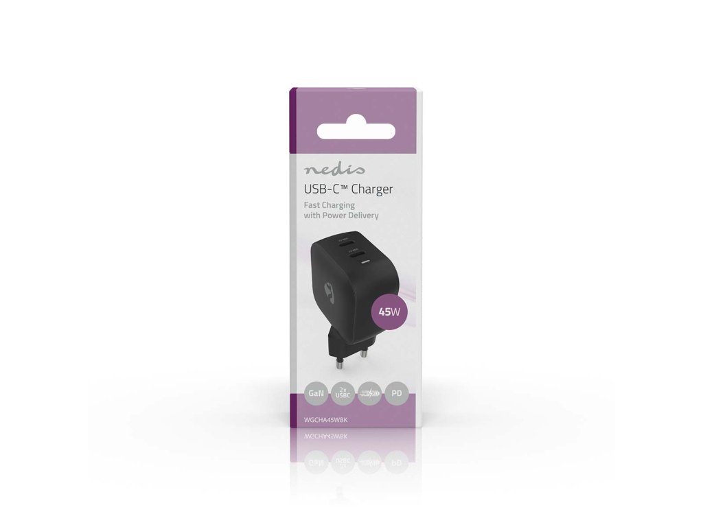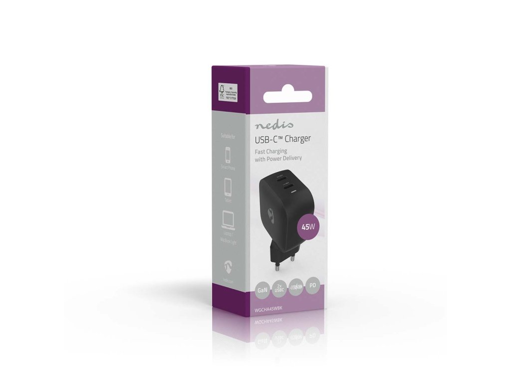 Nedis WGCHA45WBK 45 W GaN rychlý USB nabíjecí adaptér 2.25 A / 3 A / 2x USB-C / černá