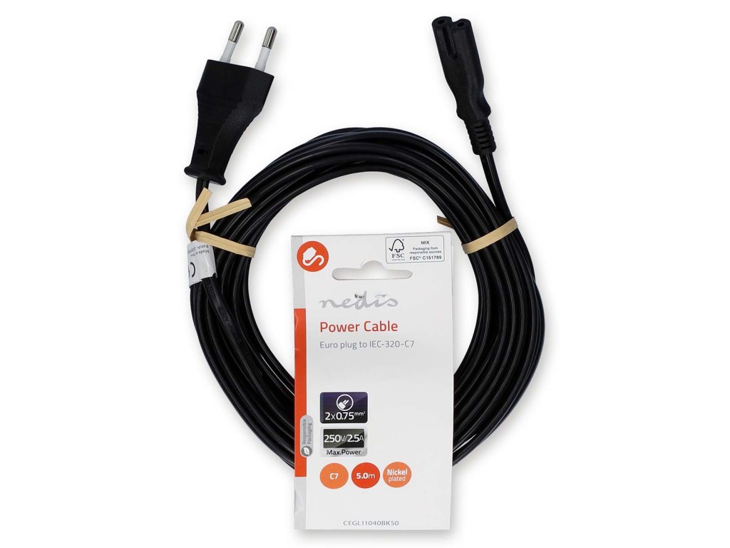 Nedis® napájecí kabel s konektory EURO zástrčka - IEC-320-C7 zásuvka (osmičková) přímá. Vhodný např. pro napájení spotřební elektroniky, monitorů, drobných spotřebičů a dalších zařízení. Délka 5 m.