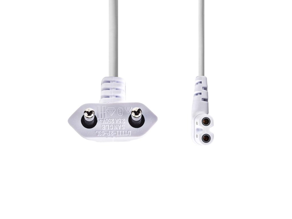 Nedis® napájecí kabel s konektory EURO zástrčka zahnutá v úhlu 90° dolů - IEC-320-C7 zásuvka (osmičková) zahnutá v úhlu 90° do strany. Vhodný např. pro napájení spotřební elektroniky, monitorů, drobných spotřebičů a dalších zařízení. Díky úhlovému provedení konektorů je ideální pro připojení k přístrojům těsně u zdi. Délka 3 m.