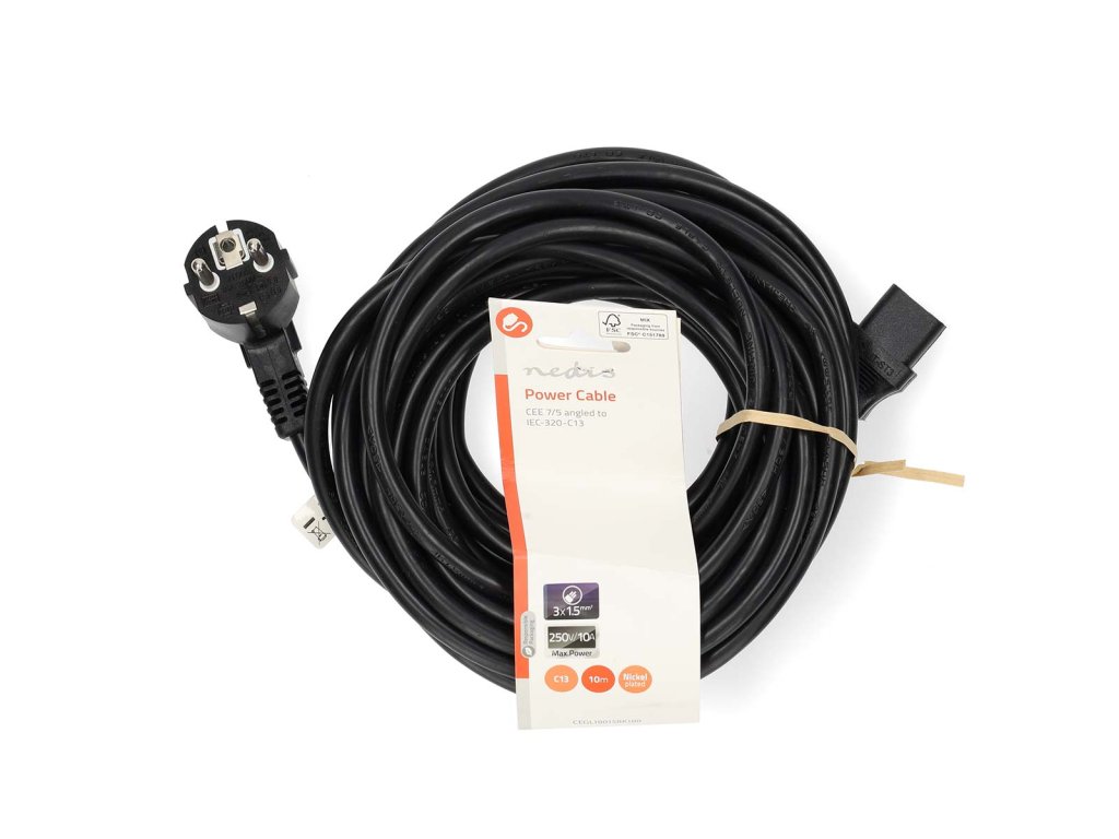 Nedis® napájecí kabel s konektory UNISCHUKO úhlová zástrčka - IEC-320-C13. Vhodný např. pro napájení stolních PC, monitorů a dalších zařízení. Vodiče 3 x 1.5 mm, zatížitelnost max. 10 A, délka 10 m. Barva černá.