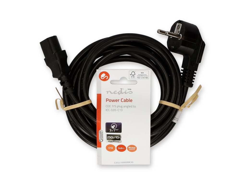 Nedis® napájecí kabel s konektory UNISCHUKO úhlová zástrčka - IEC-320-C13. Vhodný např. pro napájení stolních PC, monitorů a dalších zařízení. Délka 3 m.