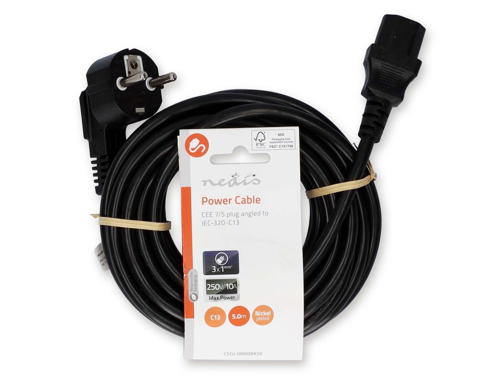 Nedis® napájecí kabel s konektory UNISCHUKO úhlová zástrčka - IEC-320-C13. Vhodný např. pro napájení stolních PC, monitorů a dalších zařízení. Délka 5 m.
