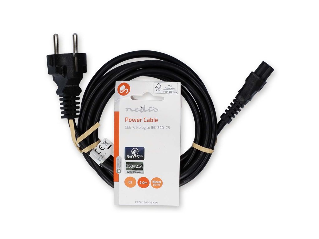Nedis® napájecí kabel s konektory UNISCHUKO přímá zástrčka - IEC320 C5 (mickey mouse). Vhodný např. pro napájecí adaptéry notebooků. Délka 2 m.