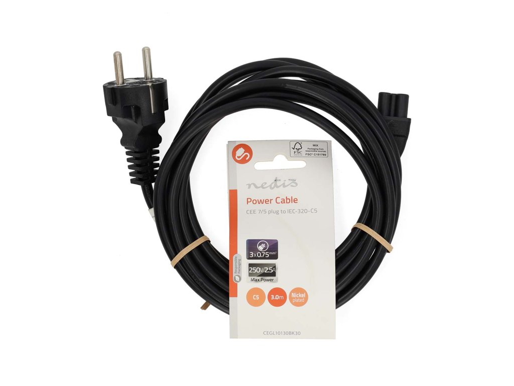Nedis® napájecí kabel s konektory UNISCHUKO přímá zástrčka - IEC320 C5 (mickey mouse). Vhodný např. pro napájecí adaptéry notebooků. Délka 3 m.