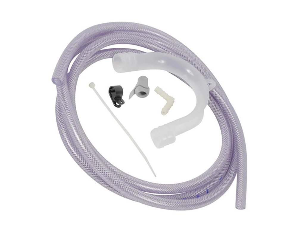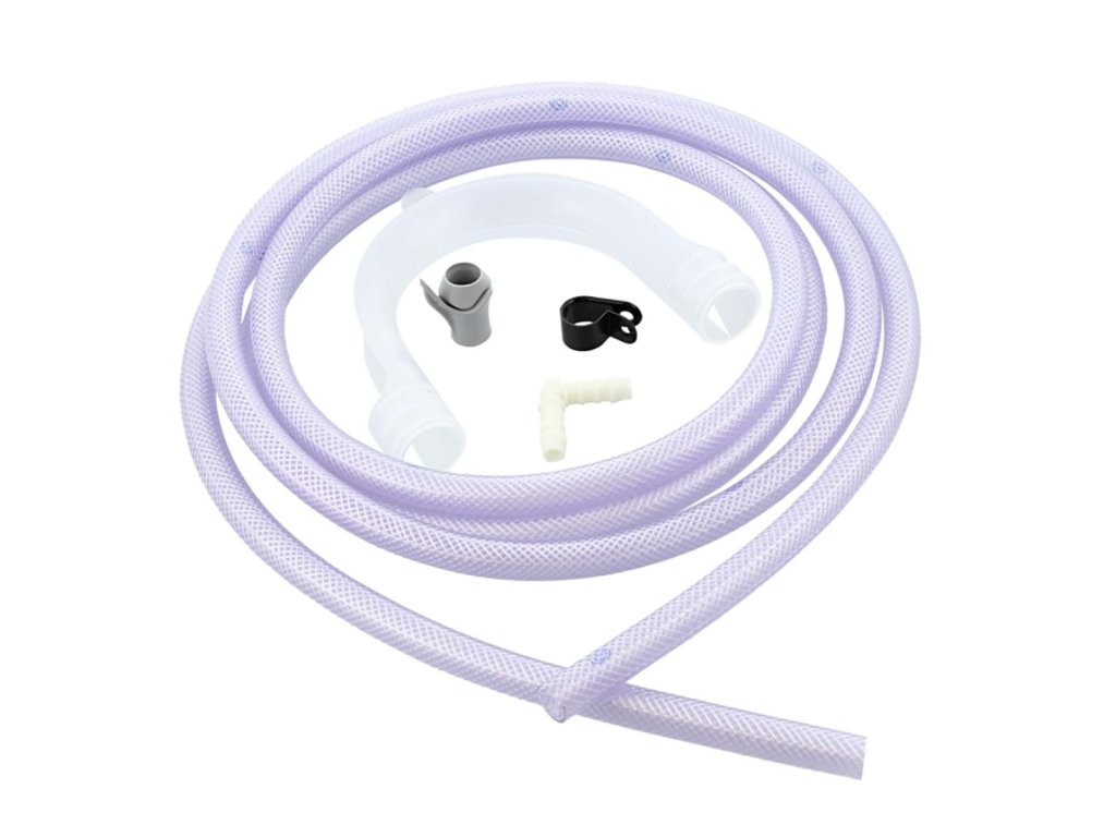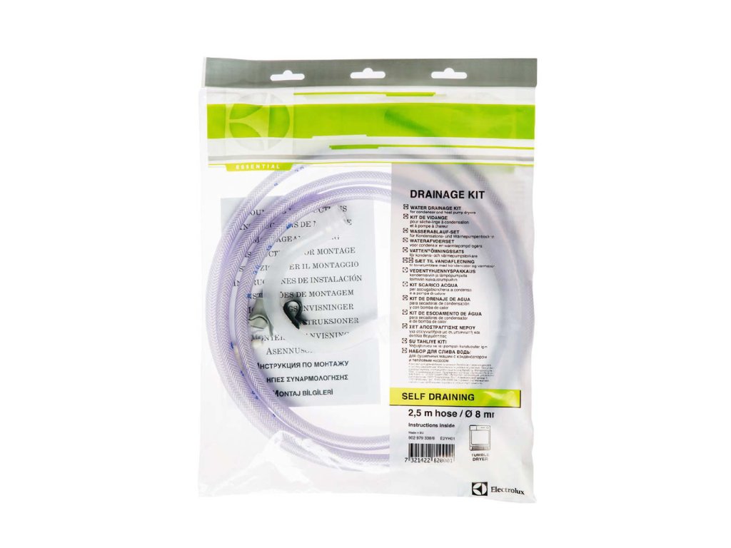 With this practical accessory set, the condensed water can be led directly into a wash basin or sink, a siphon or a drain without having to empty the water container at the end of the program. Content: 2.5m semi-transparent hose 1 nylon strap 1 90 ° connector for the drain hose 1 bent plastic piece for draining into a wash basin or kitchen sink 1 plastic holder for attaching the drain hose to the rear of the device 1 seal