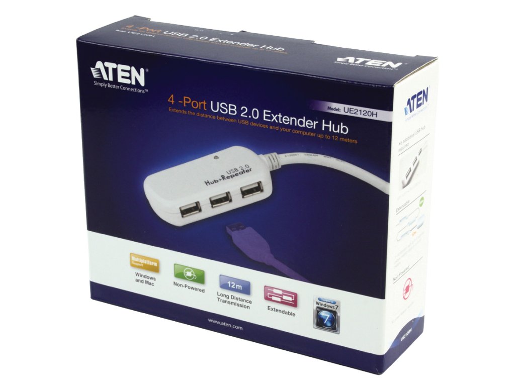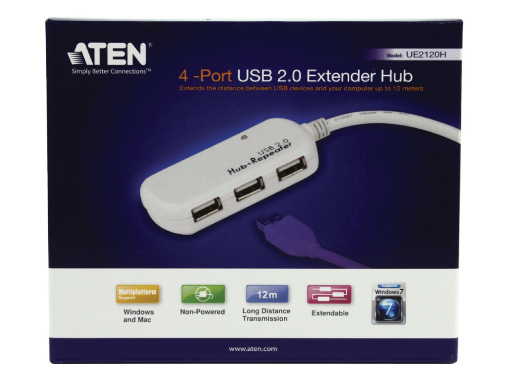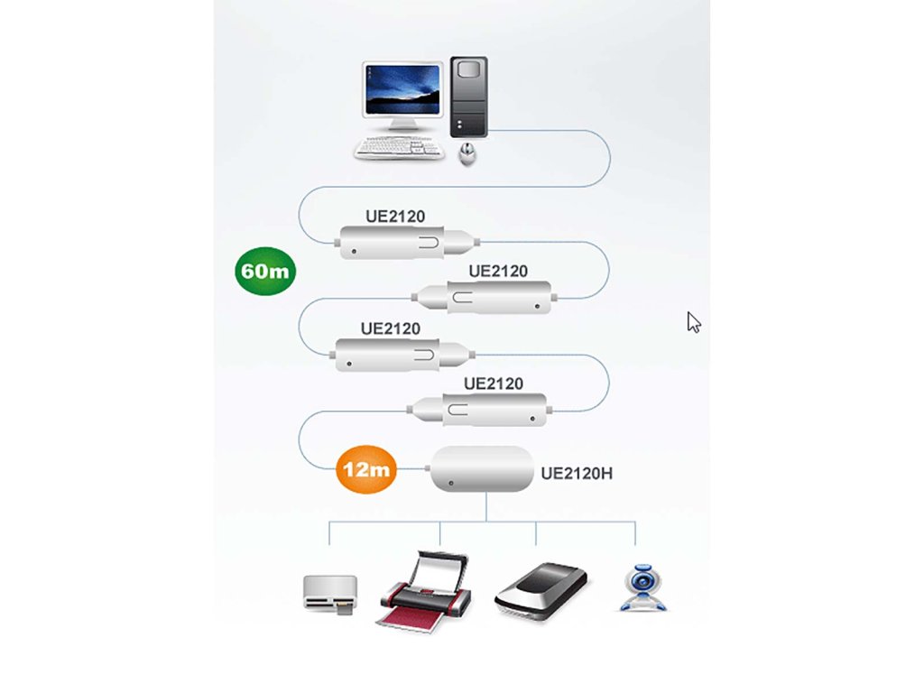 The UE2120H allows users to extend the distance between a computer and USB device(s) up to 12 meters via the active extender hub. USB signals transmitted through these cables maintain optimal signal integrity and meet USB 2.0 standards. Up to 4 extender cables (UE2120) and 1 Extender Hub (UE2120H) can be chained together, so that cable distance is increased by up to 60 meters.