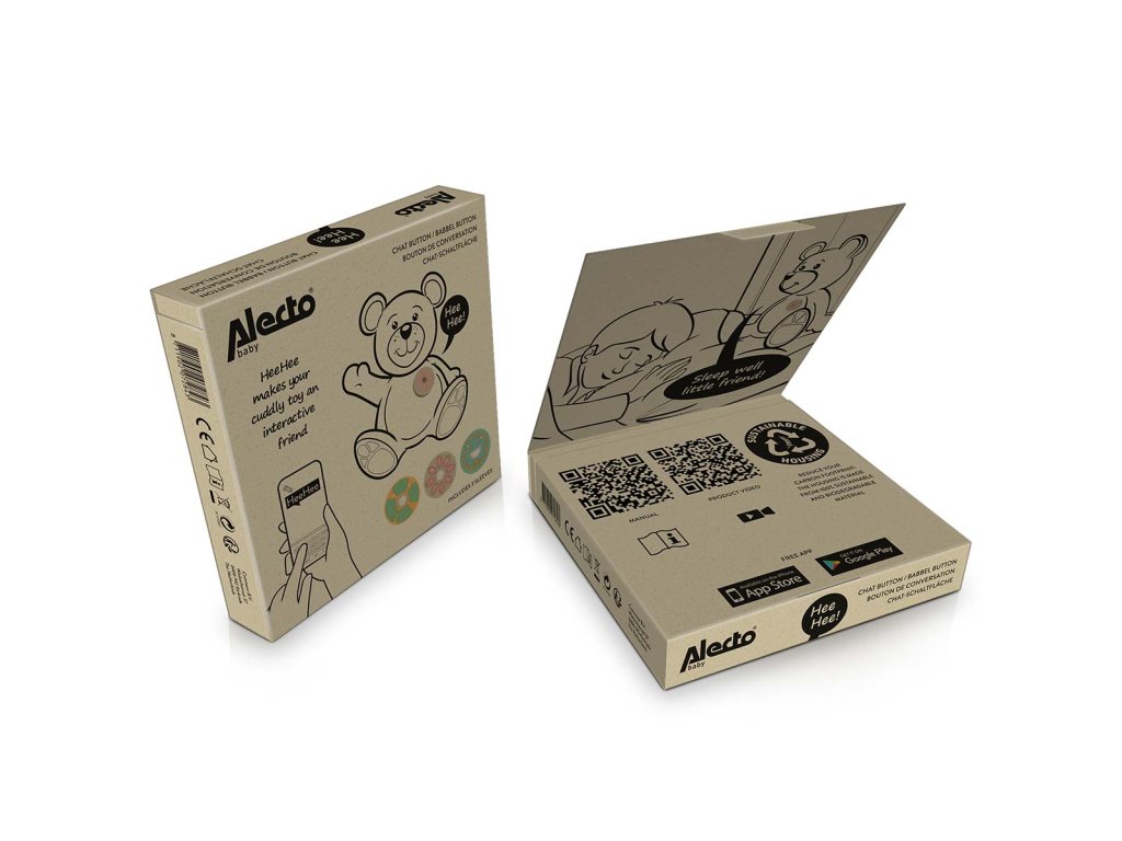 Alecto Baby HeeHee knoflík na povídání se dodává se třemi veselými silikonovými kryty (čtyřlístek, květina a sluníčko), z nichž jeden zakrývá knoflík. Díky přiloženému suchému zipu lze tlačítko snadno připevnit k měkké hračce a opět uvolnit. K dispozici je dostatečné množství suchých zipů pro připevnění knoflíku ke třem plyšovým hračkám. Stáhnete si a nainstalujete bezplatnou aplikaci HeeHee pro Android a iOS. Ujistěte se, že je zapnutá funkce Bluetooth® a připojte se k tlačítku. Zvolte požadovaný jazyk (holandština, angličtina, němčina, francouzština, španělština, dánština, norština a švédština) a sledujte, jak se zázrak odehrává.