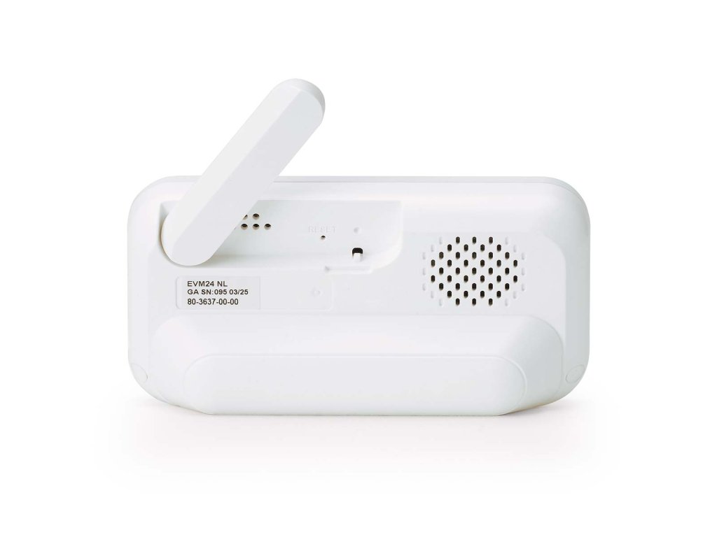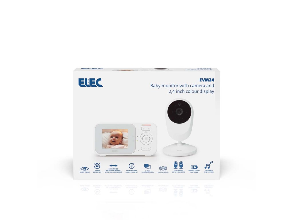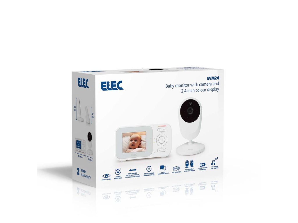 Looking for a high-quality baby monitor equipped with all the essential functions at a surprisingly sharp price? The Elec EVM24 combines ease of use and reliability with the best value for money. The baby monitor with camera features, among other things, a 2.4-inch colour display, on which your child is clearly visible even in the dark thanks to the night vision. The baby monitor switches on automatically as soon as sound is detected, and with the two-way talkback function you can speak to your child remotely. You can decide at which sound level the baby monitor becomes active by adjusting the microphone sensitivity. Extra functions such as the zoom function and soothing lullabies and natural sounds create a safe and comfortable environment for your child. This way, you can be sure your baby sleeps safely and comfortably, while you stay informed wherever you are in the house! Excellent image quality, even in the dark With the EVM24 you enjoy clear images on the 2.4-inch colour screen. The camera can be manually adjusted to the right angle so that you have a perfect view of your child. Night vision ensures you have a clear image of your child even in the dark. Want to take an even closer look? That’s easy with the 2x digital zoom function. This allows you to see more detail without having to move the camera. Automatic activation when sound is detected The baby monitor automatically switches on when sound is detected near the baby unit. You can adjust the microphone sensitivity yourself, and in doing so decide at which sound level the parent unit screen switches on – convenient and energy-saving. The rechargeable parent unit has a standby time of up to 20 hours! Optimal range The Elec EVM24 offers an optimal range within the legal limits for radiation. With a range of up to 50 metres indoors and up to 300 metres outdoors, the baby monitor complies with strict safety and radiation requirements. This ensures both a safe and reliable connection. Secure connection The communication technology used by the EVM24, Digital 2.4GHz FHSS, ensures a stable and secure connection between the baby and parent unit. This means you don’t have to worry about interference or unauthorised access: 100% interference-free and guaranteed privacy! Convenient functions The baby monitor offers several convenient functions for maximum ease of use. With the two-way talkback function, you can talk to your child (or partner) via the baby monitor. This way you can reassure your little one with your voice, wherever you are. The built-in lullabies and calming natural sounds help your child fall asleep. The baby monitor is suitable for wall mounting and comes with a handy wall-mounting template. The EVM24 is a plug-and-play baby monitor: simply plug it in and you can keep an eye on your child straight away! Expandable up to two cameras with the EVM24C You can easily expand the EVM24 with an additional camera: the EVM24C. This camera is available separately and offers the same features as the EVM24’s camera. With this expansion unit, you can monitor multiple rooms with the same parent unit or view the room from different angles. Perfect for families with multiple children or bedrooms, or when your little one stays over more often. Main features: Baby monitor with camera and 2.4-inch (6.1 cm) colour display Optimal range (up to 50 m indoors, up to 300 m outdoors) Baby monitor automatically switches on when sound is detected Night vision: clear image in the dark Two-way talkback function (two-way communication) Rechargeable parent unit with long standby time (up to 20 hours) With lullabies and nature sounds Adjustable microphone sensitivity for sound activation With 2x zoom function Energy-saving Full Eco mode Expandable up to 2 cameras with the EVM24C Secure connection Plug-and-play Suitable for wall mounting Technical specifications: Dimensions baby unit (h x w x d): 10.5 x 6.8 x 6.8 cm Dimensions parent unit (h x w x d): 6.2 x 12 x 3.6 cm What's in the box? Parent unit Baby unit Parent unit adapter Baby unit adapter Wall-mounting template Quick start guide