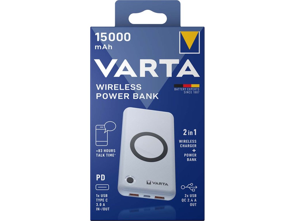Bezdrátové powerbanky VARTA 2 v 1 se dodávají ve třech různých kapacitách od 10 000 mAh do 20 000 mAh, aby vyhovovaly každé individuální potřebě energie. Produkt podporuje rychlé bezdrátové nabíjení 10 W a je vybaven funkcemi Power Delivery a Quick Charge, které podporují superrychlé a inteligentní nabíjení s výkonem až 20 W. Díky pokročilé bezpečnostní technologii a průchozímu nabíjení jsou bezdrátové powerbanky VARTA dokonalým zdrojem energie, který umožňuje nezávislost na cestách.