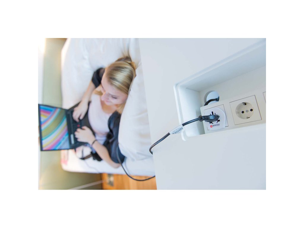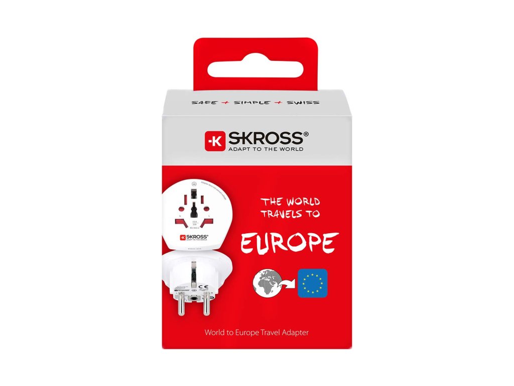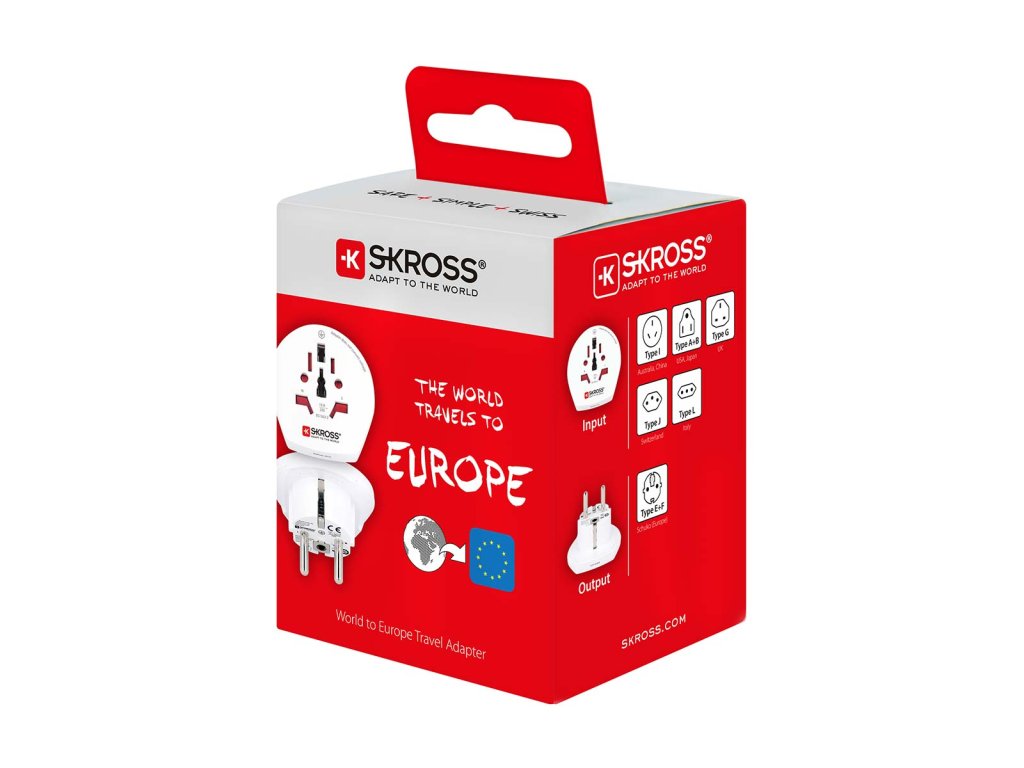 Svět do Evropy Pro 2- a 3-pólová zařízení z více než 220 zemí Euro standardní zásuvka se používá ve více než 100 zemích po celém světě, ale převážně v Evropě. SKROSS® Country Adapter World to Europe poskytuje spolehlivé a snadné připojení pro zařízení z více než 220 zemí pro použití tohoto typu zásuvky, což umožňuje bezpečně používat energeticky náročná zařízení, jako jsou notebooky a vysoušeče vlasů. • Navrženo ve Švýcarsku • Vhodné pro zařízení s uzemněnými a neuzemněnými zástrčkami (2- a 3-pólové) • Nádoby pro: Švýcarsko, Itálie, Brazílie, Velká Británie, USA/Japonsko, Austrálie/Čína, Euro • Výstupní zástrčka: Evropa • Vstupní napětí: 100 V – 250 V • Max. zatížení: 16A • Výkon: např. 100 V – 1600 W / 250 V – 4000 W • Nekonvertuje napětí