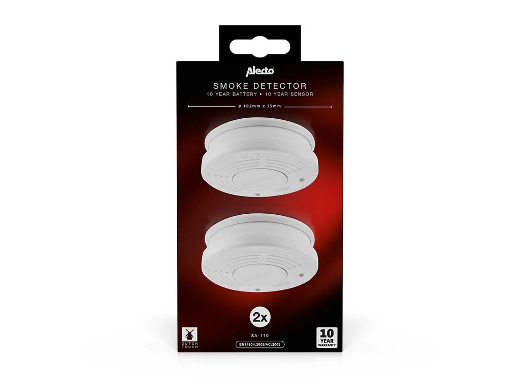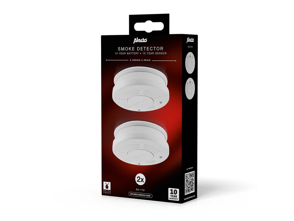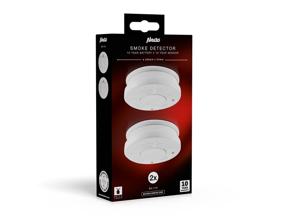 Detektor kouře s 10letou životností baterie Detektor kouře je malé zařízení, které poskytuje ochranu před kouřem a ohněm. Detektor kouře je nezbytný v každé domácnosti a kanceláři. Pokud dojde k požáru, musíte o něm okamžitě vědět, abyste mohli odpovídajícím způsobem jednat. Tento detektor kouře SA-110 DUO tuto činnost splní za vás. Při detekci kouře vás detektor kouře upozorní alarmem o síle 85 decibelů. Pro srovnání, tuto úroveň doporučují lékaři při nošení špuntů do uší. Jinými slovy, úroveň zvuku, kterou nemůžete nikdy přehlédnout! Velkou výhodou hlásiče SA-110 DUO je vestavěná lithiová baterie, která vám zajistí 10 let provozu. Po instalaci už nikdy nemusíte myslet na nepříjemnosti spojené s výměnou baterie. Na tento výrobek se navíc vztahuje 10letá záruka. Naši zákazníci nám říkají, že si SA-110 DUO vozí i na adresu své dovolené, aby měli jistotu správné ochrany. Proč byste se na dovolené smiřovali s méně než dokonalou bezpečností? Dlouhá životnost a snadná montáž Tento kompaktní designový detektor kouře má zabudovanou lithiovou baterii s životností 10 let, vedle toho má dlouhou životnost 10 let i čidlo. To zaručuje, že váš detektor kouře bude fungovat nejméně 10 let po instalaci. Představte si ty výhody; už nikdy nebudete muset kupovat nové baterie do detektoru kouře, což vám ušetří peníze, a už nikdy nebudete muset kvůli jejich výměně brát žebřík. Tato dlouhá životnost přináší také větší bezpečnost a klid, protože nehrozí, že by se baterie v nouzové situaci vybila. Tlačítko Time-out, hush, test a resetování Pokud dojde k požáru, SA-110 DUO vás bude okamžitě informovat velmi hlasitým alarmem. Pokud je požár malý a podaří se vám ho uhasit, můžete alarm ručně vypnout. Doporučuje se často testovat hlásiče kouře, k čemuž používáte stejné tlačítko. Pro mimořádně snadné použití a bezpečnost je celá přední strana tlačítkem Hush / Test. Takto tlačítko nikdy nemůžete přehlédnout, zejména pokud k jeho stisknutí používáte tyč nebo koště. SA-110 DUO zkrátka nabízí: • Sada 2 detektorů kouře • Vysoká kvalita, splňuje normu EN14604:2005/AC:2008 • Dlouhou životnost 10 let díky mimořádně silné lithiové baterii. • Na tento výrobek se vztahuje 10letá záruka • Hlasitý alarm 85 dB • Rychlá a snadná montáž • Rychlá reakce na doutnající požáry • Ideální ochrana, kterou si můžete vzít s sebou na dovolenou Se značkou Alecto si vyberete dobře navržené a snadno použitelné výrobky prvotřídní kvality. Co je v balení? • Detektor kouře se zabudovanou lithiovou baterií 2x • Montážní deska 2x • Šrouby a zástrčky 4x • Návod k obsluze NL / EN / DE / FR / ES • Univerzální návod