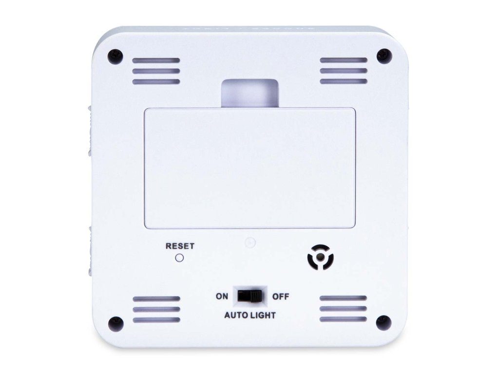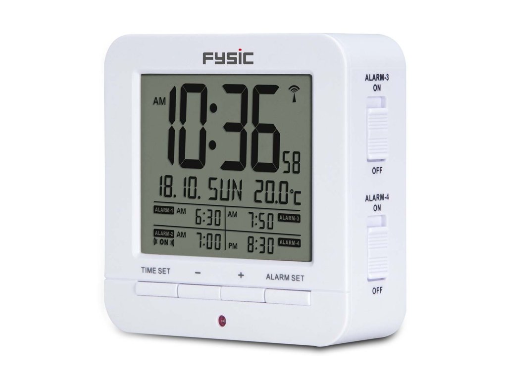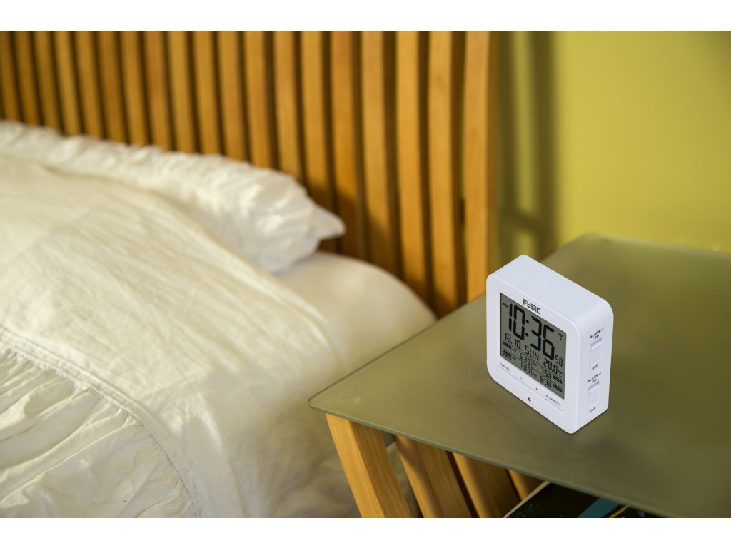 Hodiny DCF s teplotou • Fysic FKW-8 Budík s teploměrem • Ukazatel vnitřní teploty • 4 časy buzení s funkcí odloženého buzení • Barva: bílá Fysic FKW-8 jsou bílé DCF hodiny s ukazatelem teploty. Lze je použít jako stojací hodiny kdekoli v domě, ale jsou vhodné zejména pro každodenní použití jako budík. Tyto hodiny využívají rádiový signál DCF. Tento signál, který lze přijímat všude v Evropě, přenáší přesný atomový čas prostřednictvím rádiových vln. Budík tento signál přijímá a zajišťuje správné zobrazení času s přesností na milisekundy. Už se nemusíte starat o to, zda máte správný čas. Přizpůsobování hodin změnám letního času je také minulostí. Všechny informace viditelné na první pohled Teplotní hodiny Fysic FKW-8 DCF zobrazují na první pohled všechny informace, které byste od hodin očekávali. Kromě času se na digitálním displeji zobrazuje také správný den v týdnu a datum. V hodinách Fysic FKW-8 je také zabudovaný teploměr, který ukazuje vnitřní teplotu. Ideální budík Hodiny DCF s teplotou jsou užitečné zejména při použití jako budík. Je vybaven funkcí pro zadání čtyř různých časů buzení. Pokud si například přejete ležet, má možnost jednorázového nastavení. Budík, který uslyšíte v různých časech buzení, lze odložit o několik minut pomocí funkce odložení buzení. Báječný pocit: otočte se na chvíli, aniž byste se museli bát, že zaspíte. Budík je vybaven automatickým osvětlením displeje, abyste mohli budík snadno ovládat a číst i v noci za tmy. Co je součástí balení? • Budík s teploměrem • Návod k obsluze NL / EN / DE / FR