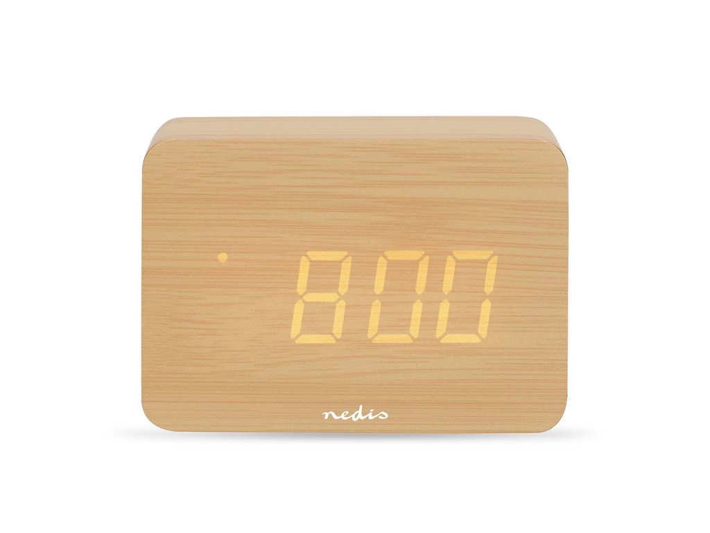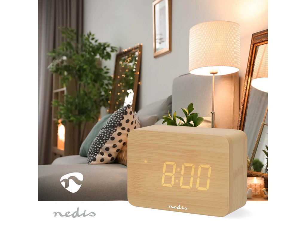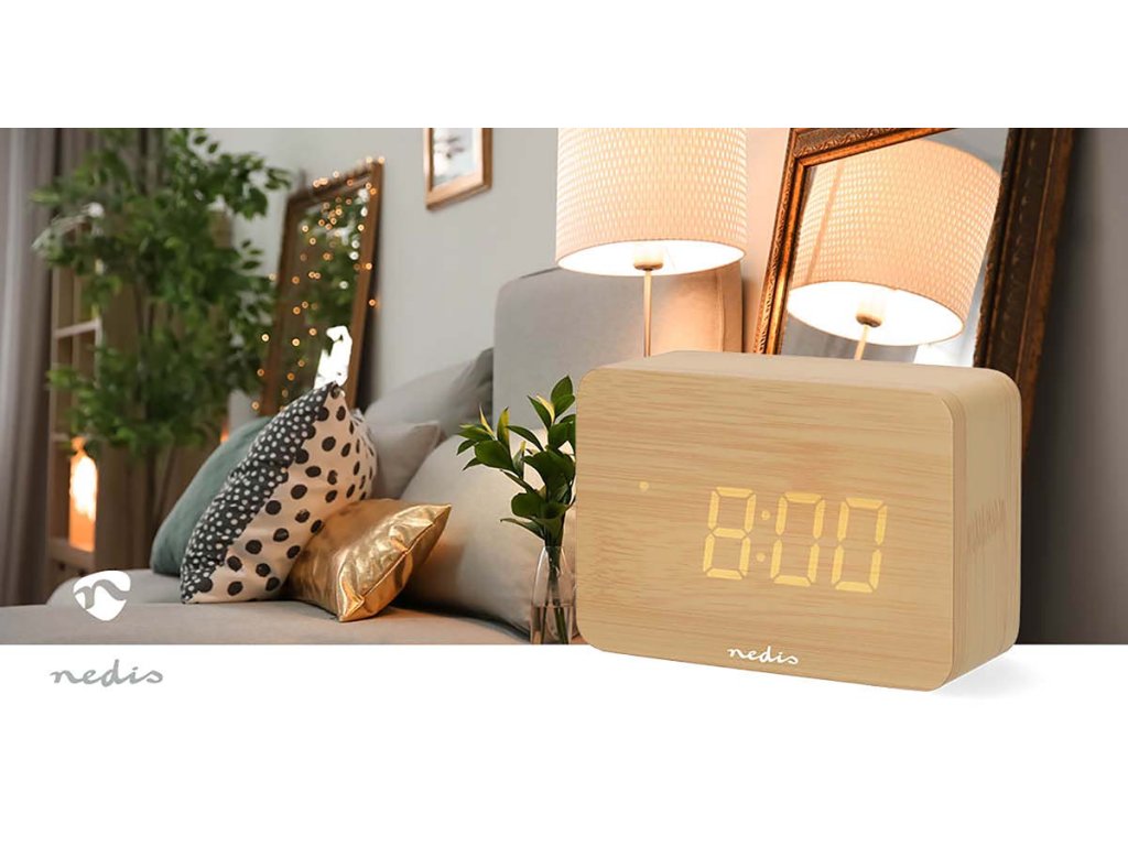 Malý digitální budík Nedis kombinuje minimalistický design s praktickou funkčností a je stylovým a kompaktním doplňkem každého moderního interiéru. Tyto hodiny s atraktivní povrchovou úpravou z ekologického dřeva nabízejí přirozenou estetiku, která se bez problémů hodí do ložnic, domácích kanceláří nebo pracovních prostor. Díky svému čistému, modernímu vzhledu jsou atraktivní zejména pro zákazníky, kteří si potrpí na design. Hodiny jsou vybaveny jasným a přehledným LED displejem s teplým žlutým osvětlením, které zajišťuje viditelnost, aniž by působilo rušivě. Uživatelé si mohou vybrat ze tří nastavitelných úrovní jasu, takže jsou vhodné jak pro denní, tak pro noční použití. Na displeji se opakovaně zobrazuje čas, datum a vnitřní teplota, takže uživatelé získají klíčové informace na první pohled. Díky možnosti přepínání mezi 12hodinovým a 24hodinovým formátem si uživatelé mohou hodiny snadno nastavit podle svých osobních preferencí. Vestavěný teploměr poskytuje údaje o vnitřní teplotě ve stupních Celsia v reálném čase a podporuje tak příjemné životní nebo pracovní prostředí. Tento budík nabízí tři individuální nastavení budíku, což je ideální pro lidi s různou dobou buzení - například páry, rodiny nebo uživatele s odlišným režimem ve všední dny a o víkendu. Každý budík lze přizpůsobit konkrétním časovým rozvrhům, což zvyšuje každodenní pohodlí. Díky mimořádně kompaktnímu designu (100 x 70 x 40 mm) se hodiny úhledně vejdou na každý noční stolek, poličku nebo pracovní stůl, aniž by zabíraly mnoho místa. Pro každodenní použití jsou napájeny primárně přes USB, ale obsahují také možnost zálohování pomocí 3x AAA baterií (baterie nejsou součástí dodávky), což zajišťuje nepřetržitou funkčnost i při přerušení dodávky elektrické energie.