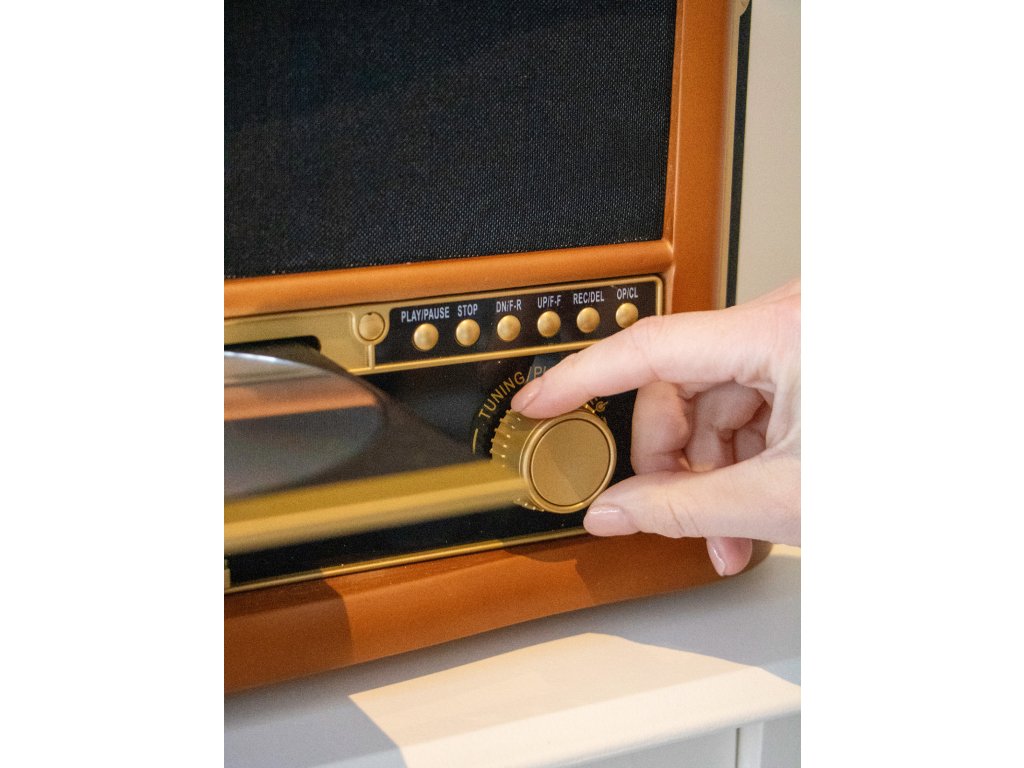 Thanks to the reliable belt drive, a technology known for its smooth and low-vibration operation, the record player delivers clear and precise playback of your beloved records. The record player supports playing records at three speeds: 33, 45, or 78 revolutions per minute. Using the metal hinge, you can position the lid of the retro record player at a 45° angle, allowing you to play your records with both an open and closed cabinet. Additionally, you can convert your favorite tracks to MP3 with the built-in USB encoding.