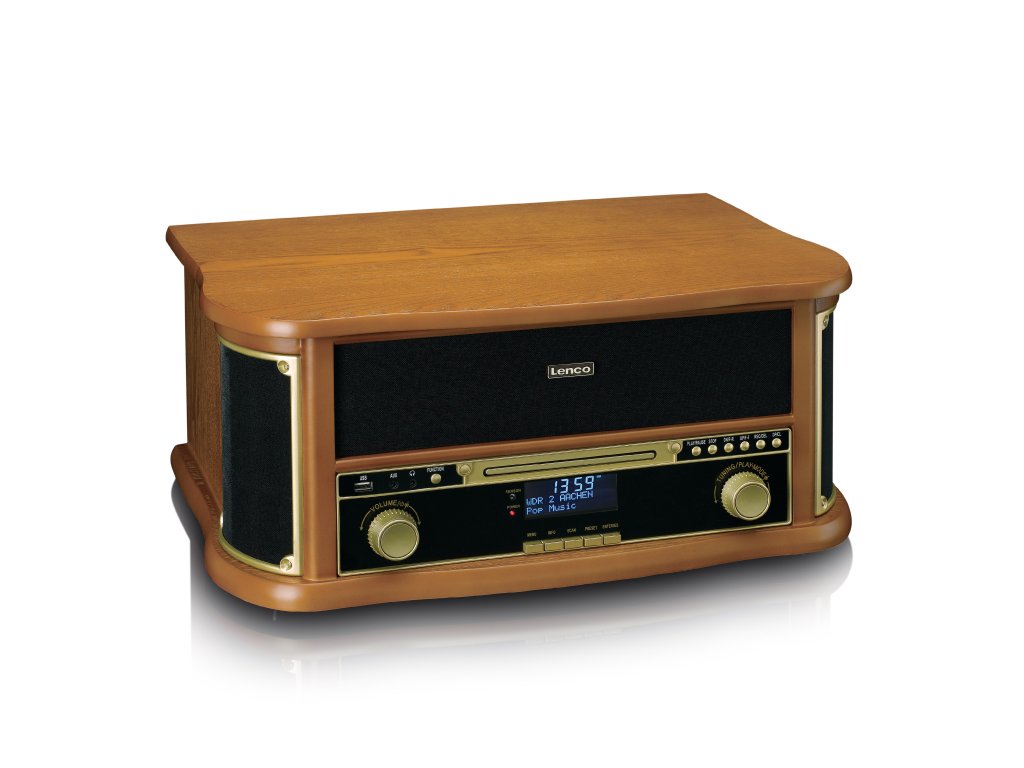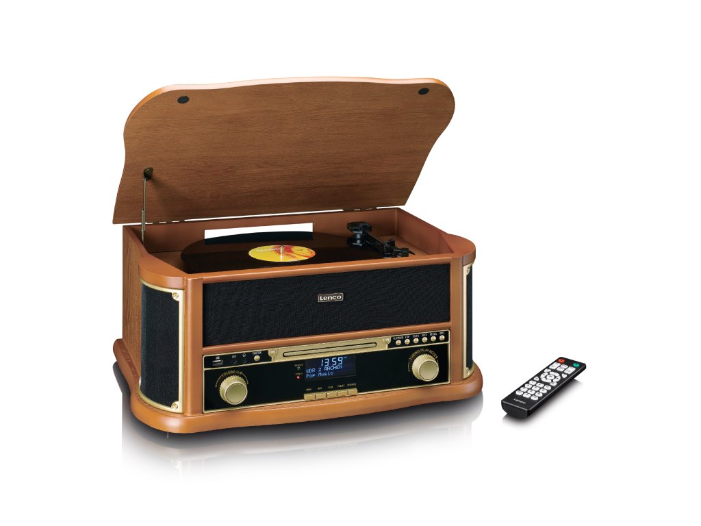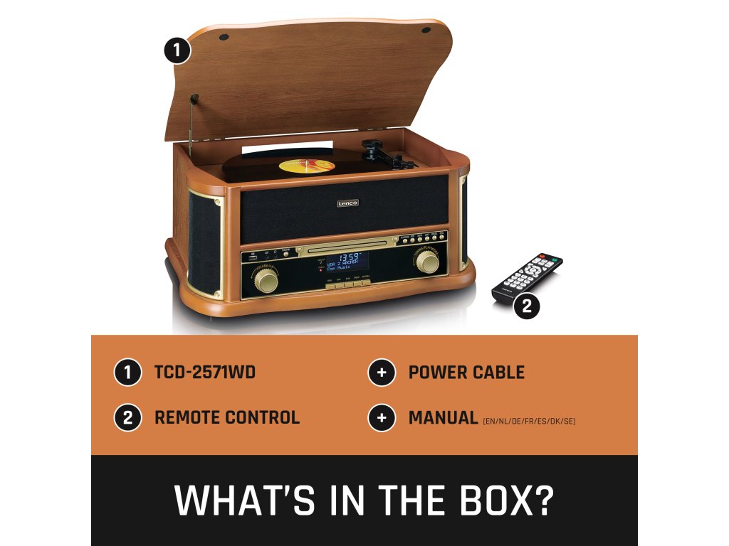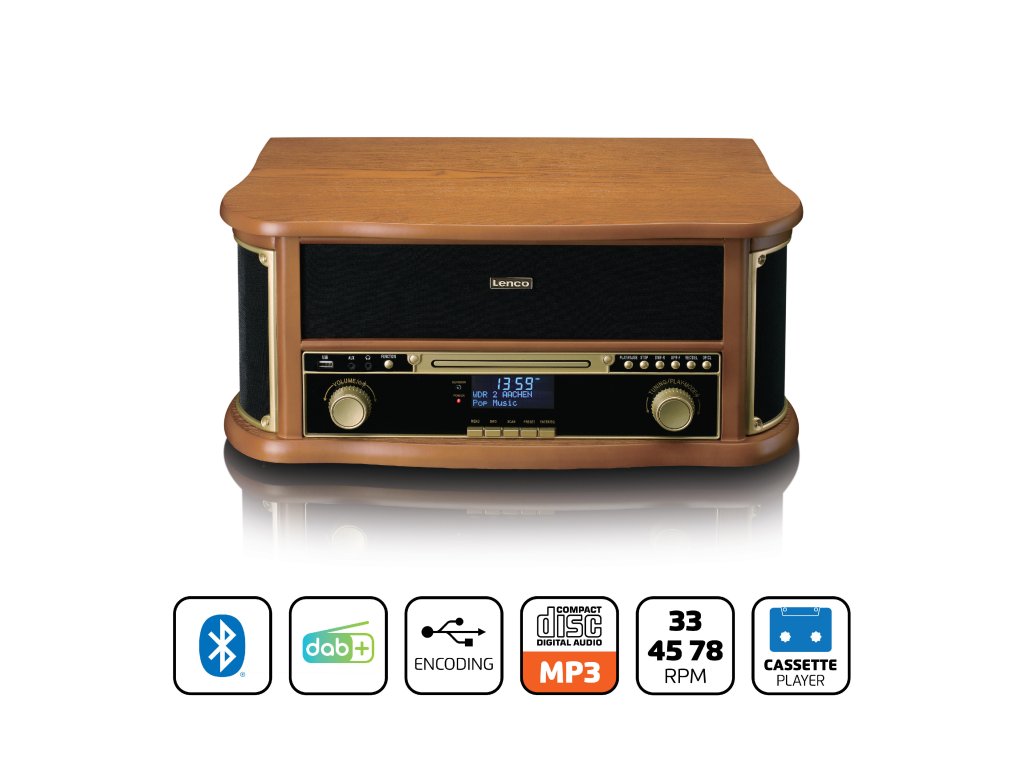 The Classic Phono (by Lenco) TCD-2571WD is an all-in-one multifunctional music system with a stunning retro design that enhances any interior. The TCD-2571WD is characterized by the built-in record player with belt drive but offers so much more. Effortlessly blending classic functionalities with modern playback options, the wooden retro record player features Bluetooth® reception, DAB+/FM radio, a built-in CD player, and a cassette player. This provides a complete listening experience with the perfect balance between the nostalgic charm of vintage aesthetics and modern functionality. The TCD-2571WD has an MDF housing and comes with a remote control for added convenience.