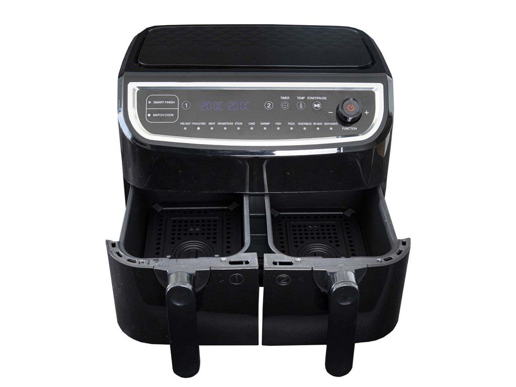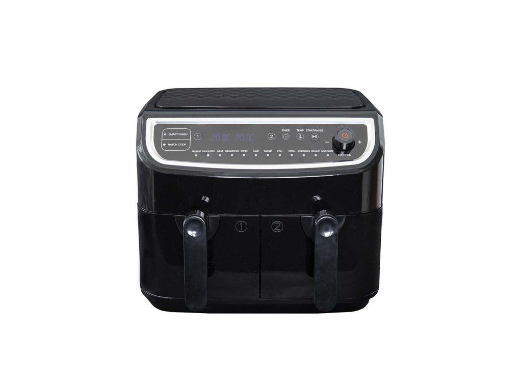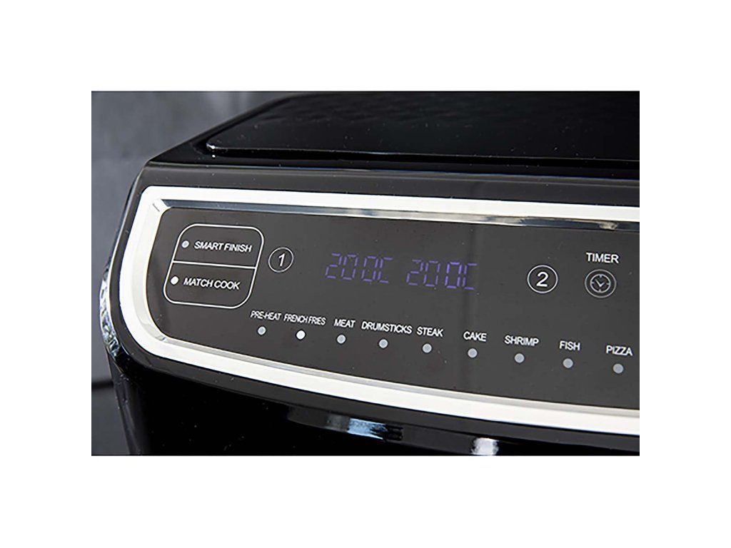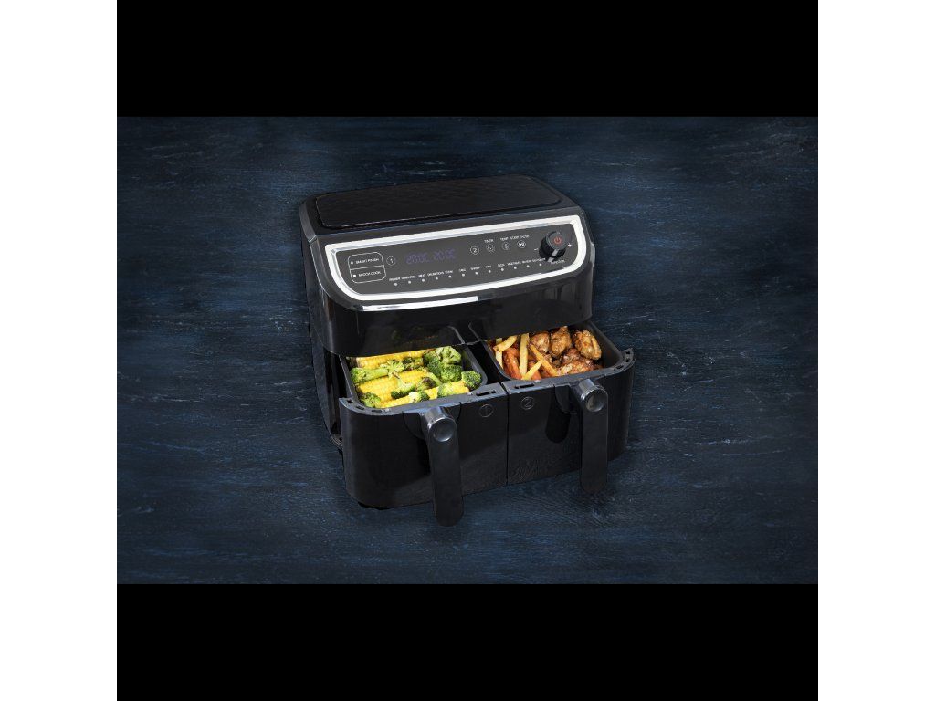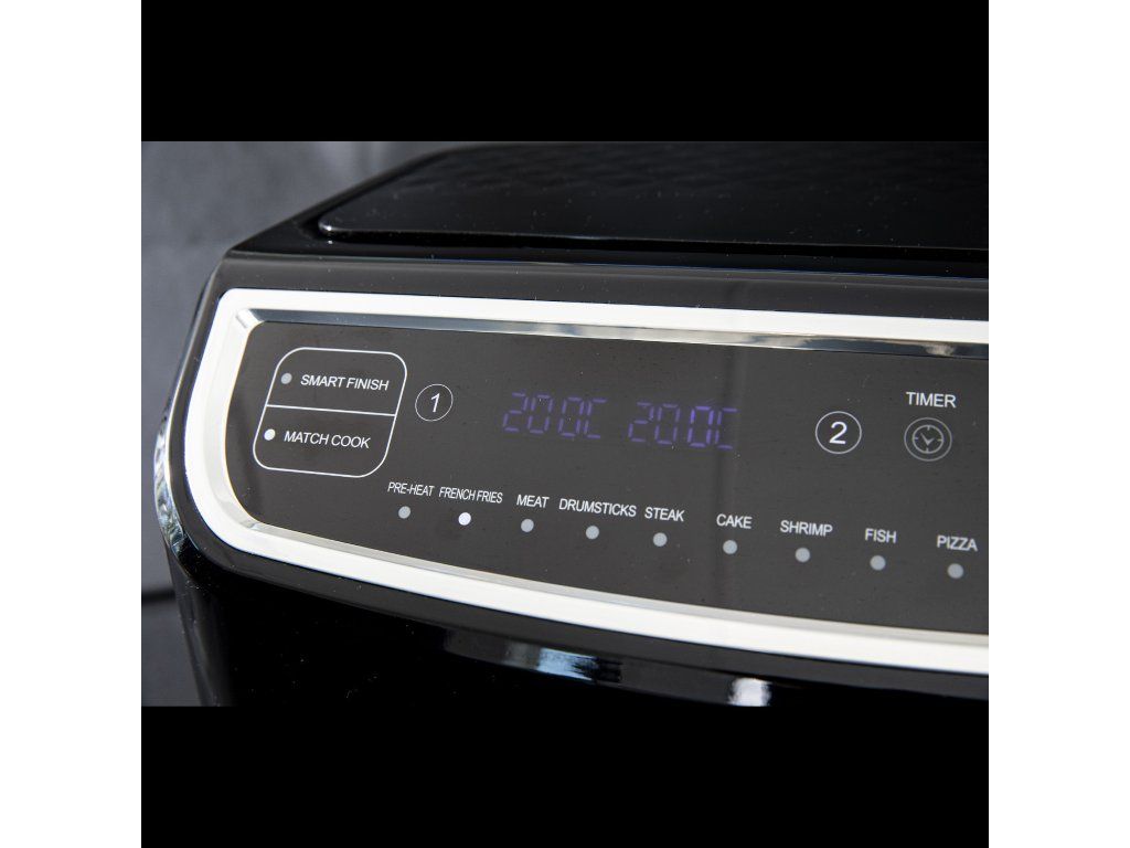 Dvojitá fritéza Gastronoma s nízkým obsahem tuku má systém cirkulace vzduchu, který připravuje potraviny rychleji a šetří elektrickou energii. Můžete vařit bez oleje a dosáhnout o 80 % méně tuku ve srovnání se smažením. Má objem 9 litrů - 2 varné koše s nepřilnavým povrchem, každý o objemu 4,5 litru. Koše lze používat odděleně a s různými teplotami a dobami vaření - ideální, pokud není třeba vařit zeleninu společně s masem. Pomocí programu Smart Finish můžete nastavit každý koš tak, aby bylo vaření dokončeno ve stejnou dobu. S programem Match Cook je příprava nastavena stejně pro oba hrnce. Oba hrnce lze mýt v myčce nádobí. K dispozici je digitální displej s dotykovým ovládáním a 12 automatických programů. Teplotu lze nastavit v rozmezí 50-200 °C a pomocí časovače můžete nastavit od 1 do 60 minut. Po uplynutí doby vaření se u každé zásuvky ozve signál. Po ukončení vaření se spotřebič automaticky vypne.