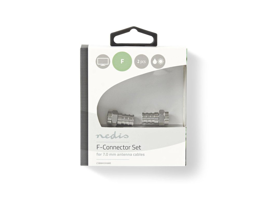 F-Konektor | Přímý | Zástrčka | Poniklované | 75 Ohm | Krimpovvací | Průměr vstupního kabelu: 7.0 mm | Měď | Stříbrná | 2 kusů | Box s Okénkem