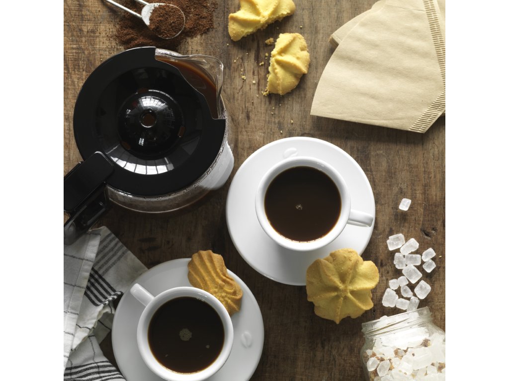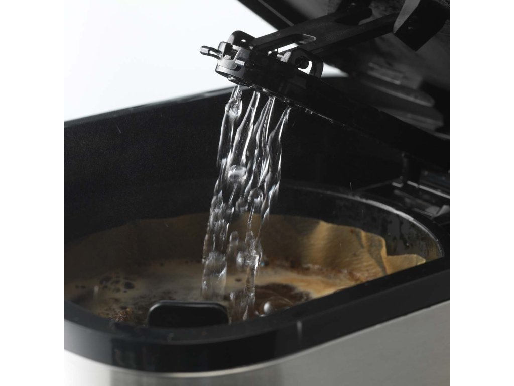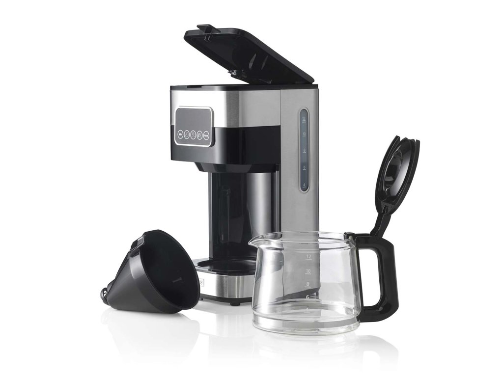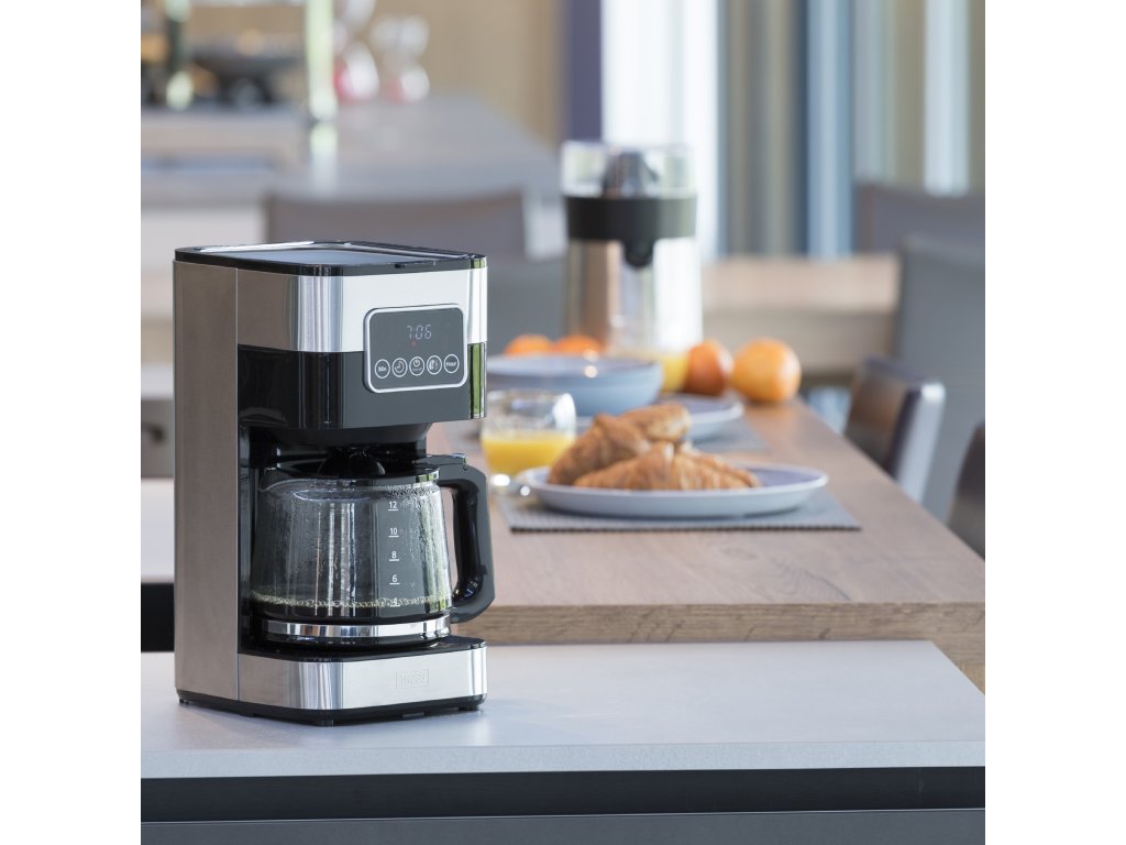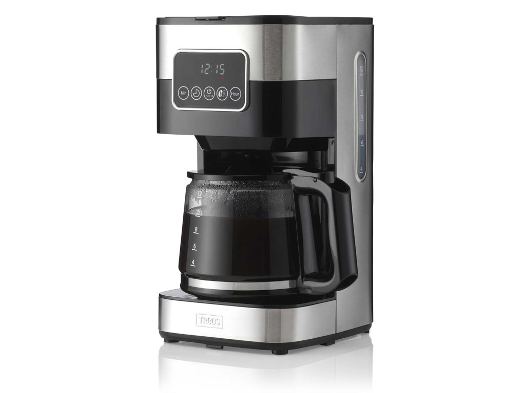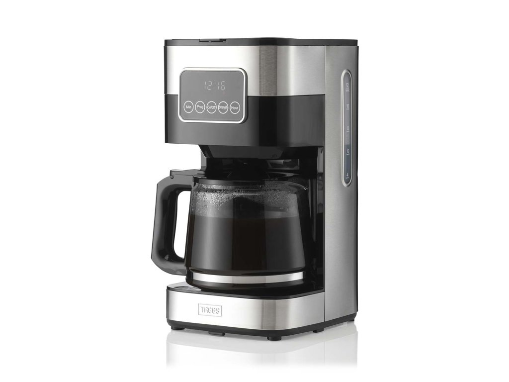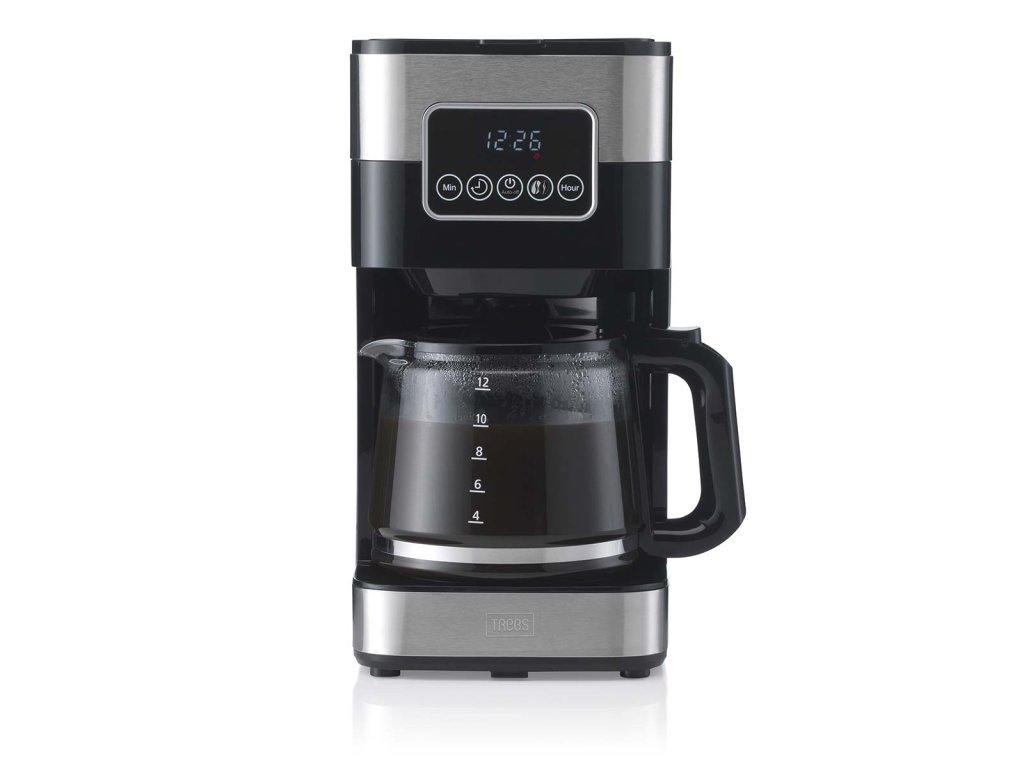 Káva je pro vás připravena Filtrační kávovar Trebs 24100 je nejlepší kávovar pro všechny, kteří ráno nestíhají připravit šálek kávy. S tímto filtrovacím kávovarem si můžete vychutnat šálek čerstvé kávy, aniž byste museli každé ráno brzy vstávat. Kávovar automaticky připraví kávu ve vámi nastavený čas. Na svůj šálek kávy tak už nikdy nebudete muset ráno čekat. Dokonalá chuť kávy Díky přednastavenému času, dotykovému LED displeji a digitálním LED hodinám vám kávovar na filtrovanou kávu zpříjemní rána. Potřebujete extra silnou kávu? S funkcí extra aroma můžete nechat vodu protékat kávou pomaleji, aby mohla lépe vstřebat její chuť. Přístroj je navíc vybaven 6otvorovým vodním difuzérem. Ten zajišťuje rovnoměrné rozdělení vody po filtru a optimální vyjádření plné chuti kávy. Vychutnejte si šálek Kávovar Trebs má nádržku na vodu o objemu 1,5 l, která vystačí na 12 šálků s jednou konvicí. Chtěli byste mít možnost vypít šálek během plnění konvice? Díky funkci sneak a cup (zastavení odkapávání) kávovar na 30 sekund zastaví plnění konvice, takže si můžete šálek nalít. Stylový a plně vybavený Kávovar na filtrovanou kávu má stylový design z nerezové oceli a disponuje výkonem 900 wattů. Aby se předešlo nebezpečným situacím, je kávovar vybaven také funkcí vyvaření do sucha. Tímto způsobem se káva nepřipraví, pokud není dostatek vody, a vy zabráníte vyhoření spotřebiče. Kávovar je dodáván se skleněnou konvicí a vertikálně vyjímatelným držákem filtru. Obojí lze mýt v myčce nádobí, a proto se snadno čistí. Filtrační kávovar Trebs 24100 je vybaven všemi vymoženostmi! Co je součástí balení? • Trebs 24100 • 1x skleněná konvice • 1x vertikální odnímatelný držák filtru • Návod k použití NL / EN / DE / FR / ES / IT / SE / TR