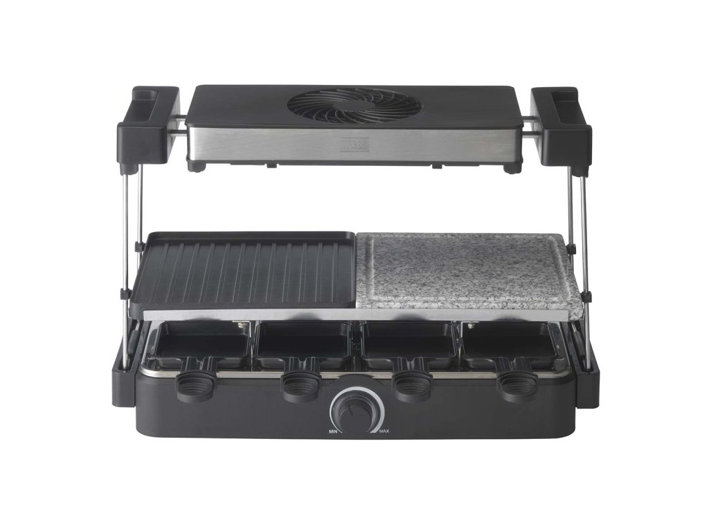 Trebs 15100 nabízí něco pro každého Gril Trebs 15100 Gourmet Cheff Grill je jedničkou mezi kombinovanými grily 5 v 1. S tímto grilem si můžete vychutnat všechny zážitky ze zábavného vaření, ale bez nepříjemných pachů. Varná kombinace se skládá z kamenného grilu, grilu, teppanyaki, raclette a gurmánského grilu. Vše v jednom. S touto kombinací si každý najde něco pro sebe! Rozlučte se s věčným gurmánským zápachem S grilem Trebs Gourmet Cheff se už nikdy nemusíte obávat typického gurmánského zápachu. Sada Gourmet obsahuje ventilátor, který funguje na vyměnitelný uhlíkový filtr. Tento automatický odsavač par aktivně odstraňuje pachy vznikající při vaření, aby se zabránilo nepříjemnému zápachu. Díky tomu se nemusíte po zbytek týdne těšit z gurmánské vůně. Konečně nastal čas vychutnat si Pohodlí je samozřejmě důležitou součástí gurmánského vaření. Pánve jsou proto vhodné pro mytí v myčce nádobí, takže už nebudete muset po zábavném večeru drhnout celé hodiny. S touto kombinací na vaření jsou také usazeniny tuku minulostí. Grilování nemusí být nezdravé a nepohodlné Maso můžete připravovat na oboustranném grilu a kombinované desce teppanyaki, zatímco zeleninu můžete smažit v pánvích gourmet/raclette. Těchto 8 pánví a obě plotýnky jsou opatřeny dvojitým nepřilnavým povrchem, takže jídlo můžete připravovat zdravě bez másla nebo oleje. Navíc se jídlo díky této vrstvě nepřipaluje. Aby nedošlo k poškození nepřilnavého povrchu, je součástí balení 8 plastových špachtlí.