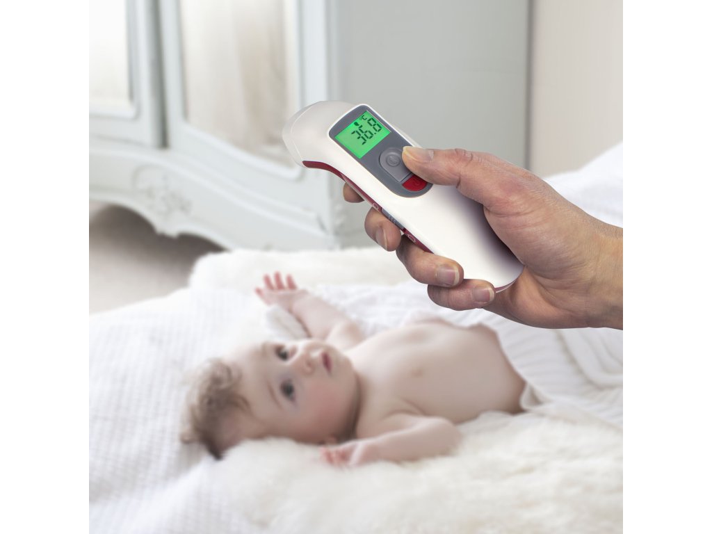 Tento jemný infračervený teploměr měří teplotu na čele. To znamená: bez potíží s teploměry v uchu nebo hýždích, Měření je rychlé a snadné a na displeji můžete nastavit stupně Celsia nebo stupně Fahrenheita. Pokud teplota stoupne nad 37 °C (nebo 98,6 °F), infračervený teploměr vás o tom informuje různými způsoby: uslyšíte zvuk, zelený displej se změní na červený a na displeji uvidíte údaj o teplotě. Tento teploměr tak mohou bez problémů používat i ti, kteří přesně nevědí, která teplota znamená horečku.
