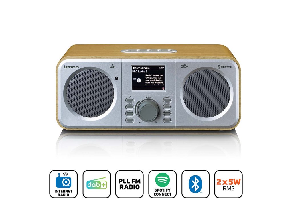Užijte si hudbu s kompletním internetovým rádiem Lenco DIR-141WD. Připojte toto stolní rádio k Wi-Fi a získejte přístup k tisícům online rozhlasových stanic. Vestavěný tuner DAB+ zajišťuje příjem digitálního rádia zcela bez šumu a křišťálově čistý. Streamujte vlastní hudbu snadno a rychle prostřednictvím připojení Bluetooth® 5.0 a k ovládání internetového rádia nebo hudby použijte bezplatnou aplikaci AirMusic. Díky funkci Spotify Connect nemusíte k radiopřijímači DIR-141WD připojovat svůj chytrý telefon, abyste mohli streamovat hudbu, a můžete se dokonce probouzet s vlastním seznamem skladeb.