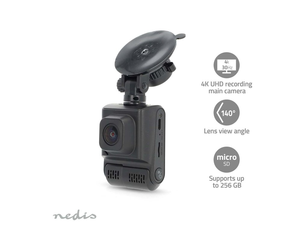 Tato autokamera Nedis pořizuje záznamy zvenku i zevnitř vozu v kvalitě 4K a 1080p, které můžete později sledovat v jasných detailech. Ideální pro záznam zábavy uvnitř karty během dlouhých cest. Autokamera je vybavena 2,0palcovým displejem LCD a širokoúhlým objektivem se záběrem 140 stupňů. Kamera pracuje s paměťovou kartou microSD až do kapacity 256 GB a nahrává ve smyčce, což znamená, že po zaplnění paměťové karty přepíše dříve nahrané soubory. Záznam se spustí a zastaví podle toho, jak spouštíte a vypínáte motor, a detekce pohybu zajišťuje, že kamera nahrává pouze tehdy, když je v zorném poli pohyb. Kamera má fotografický režim, který umožňuje pořizovat fotografie, a tlačítko zámku, které ukládá záznamy jako soubor pouze pro čtení. Má vestavěný reproduktor a mikrofon, které lze zapnout a vypnout. Integrovaná baterie poskytuje autokameře energii v případě nehody. Výrobek lze používat s aplikací s názvem Witcamplay, což je aplikace, která je přehrávačem GPS používaným v počítači nebo notebooku a umožňuje zobrazit trasu, kterou jste projeli, včetně ukazatelů rychlosti. Spotřebitel musí dodržovat platné zákony a předpisy a být si vědom toho, že tyto mohou omezovat vytváření a používání snímků z kamery