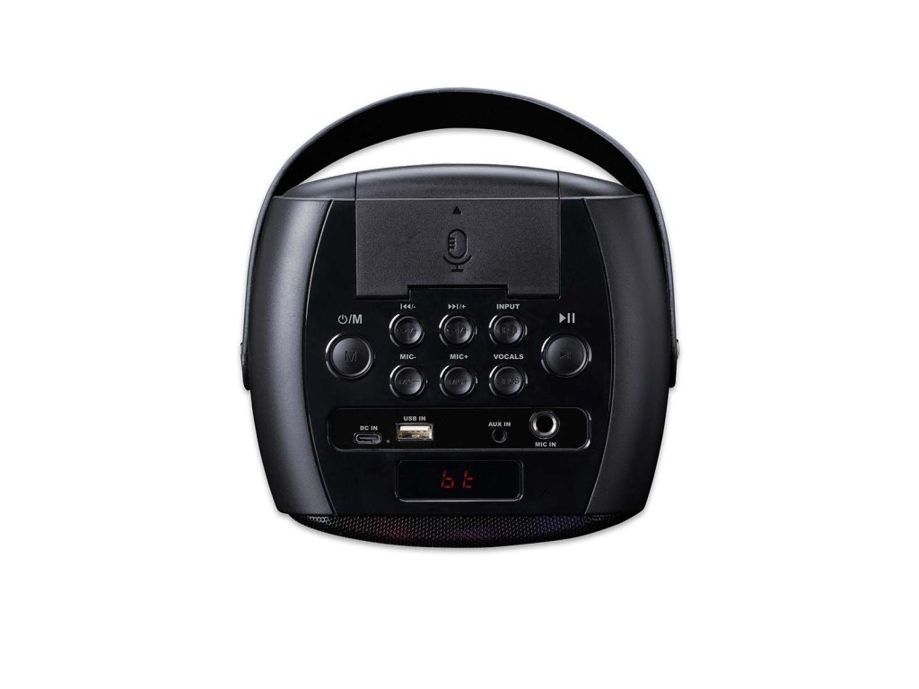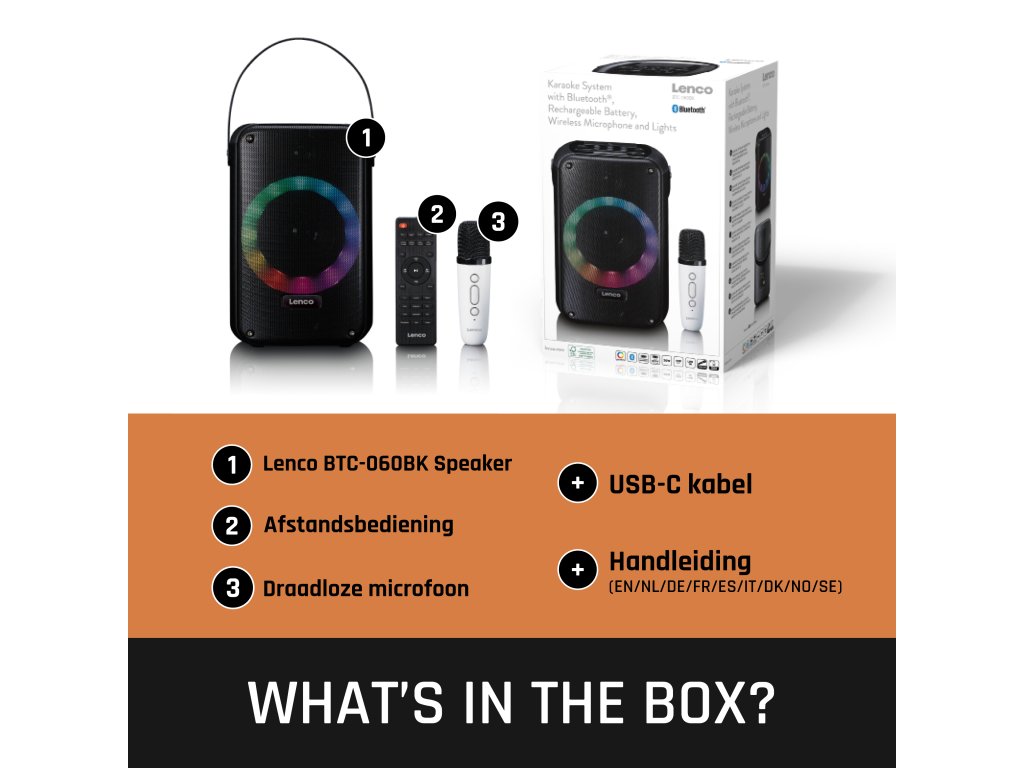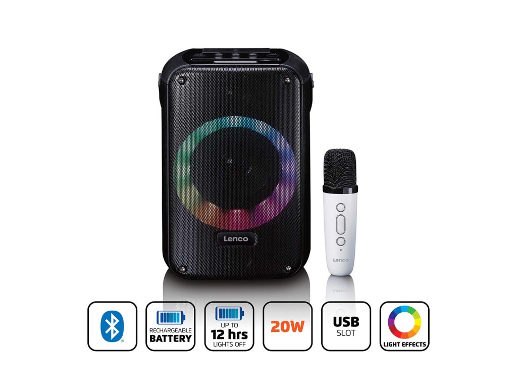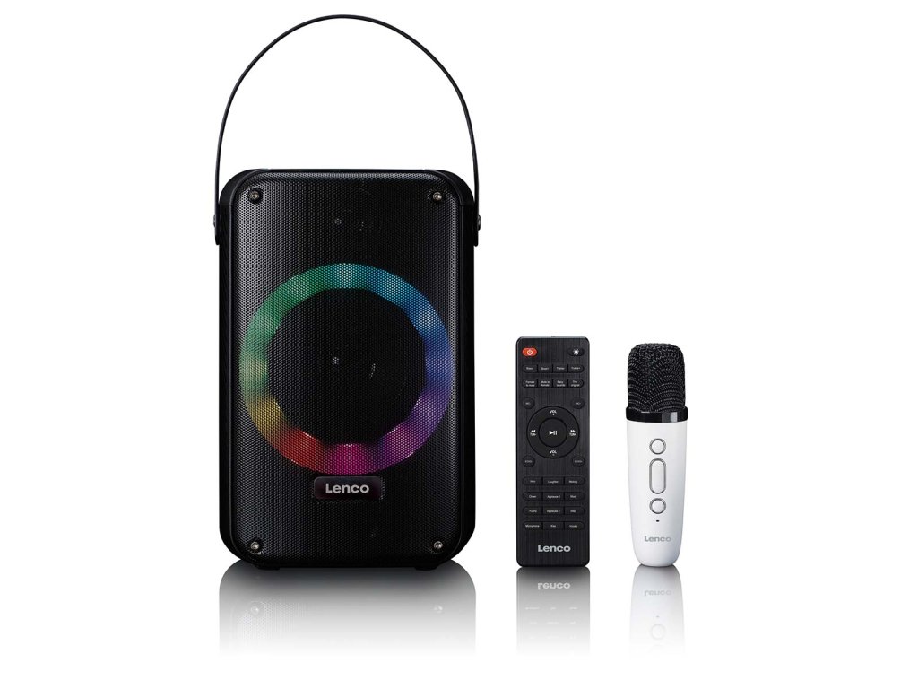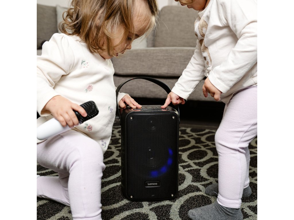 Se sadou Lenco BTC-060BK získáte kompletní karaoke set vybavený technologií Bluetooth®, dobíjecí baterií, bezdrátovým dobíjecím karaoke mikrofonem, diskotékovým LED osvětlením a dálkovým ovladačem se zvukovými efekty a měničem hlasu. Těžko si to dokážeme představit, ale nejste snad fanoušky karaoke? BTC-060BK je pro vás stále tou správnou volbou. Mikrofon pro karaoke pohodlně uložíte do reproduktoru Bluetooth. Díky přenosnému provedení a hmotnosti pouhých 1,42 kg si reproduktor můžete vzít kamkoli s sebou. Díky vestavěné dobíjecí baterii s kapacitou 2400 mAh si můžete užívat až 12 hodin nepřetržité zábavy. S reproduktorem Lenco BTC-060BK máte párty doslova ve svých rukou! Pojďme tuhle (karaoke) párty rozjet!