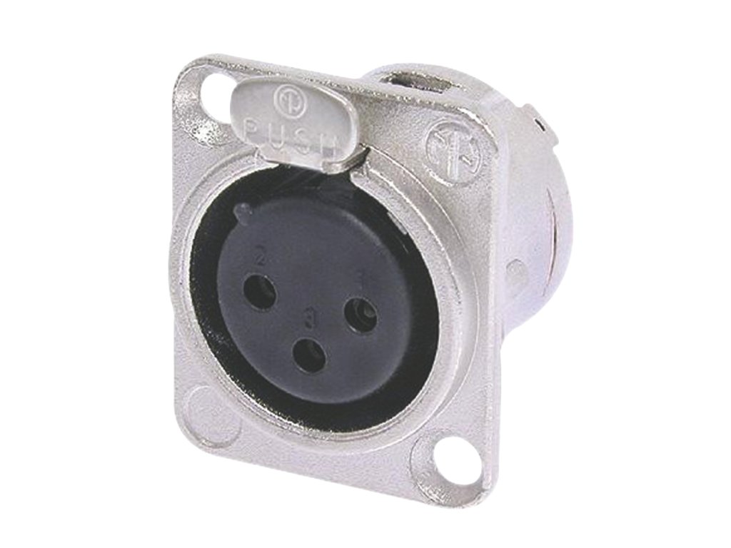 Universal D-size metal body XLR panel mount series. UL recognized component. 3 pole female receptacle, solder cups, Nickel housing, silver contacts Features & Benefits • Robust "D" metal shell • Standardized D sized 24 mm panel cutout • Solder cups on 3 - 7 pole versionDoplňkové parametry