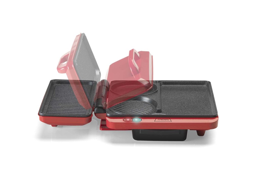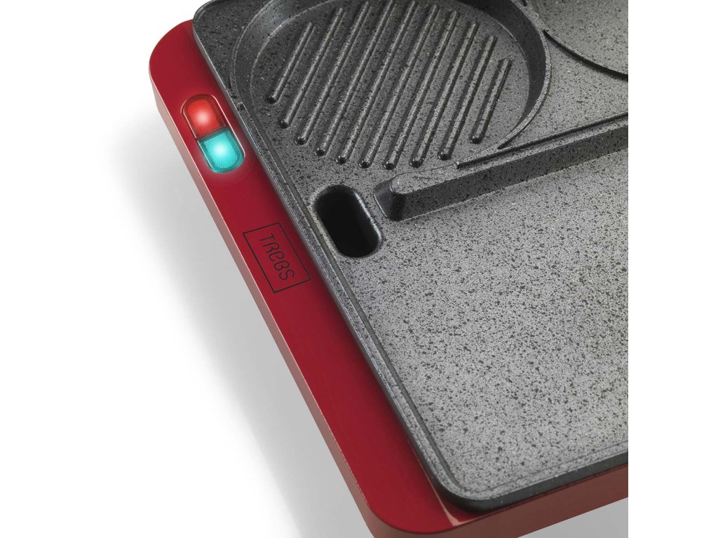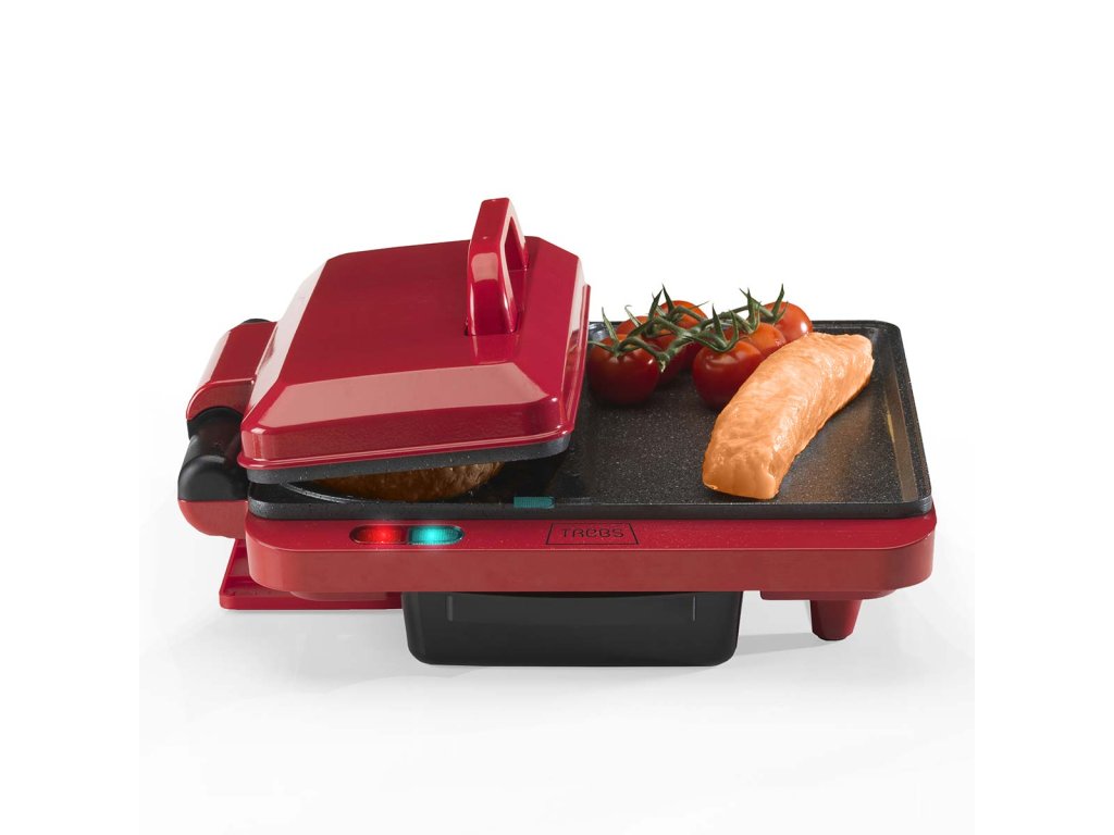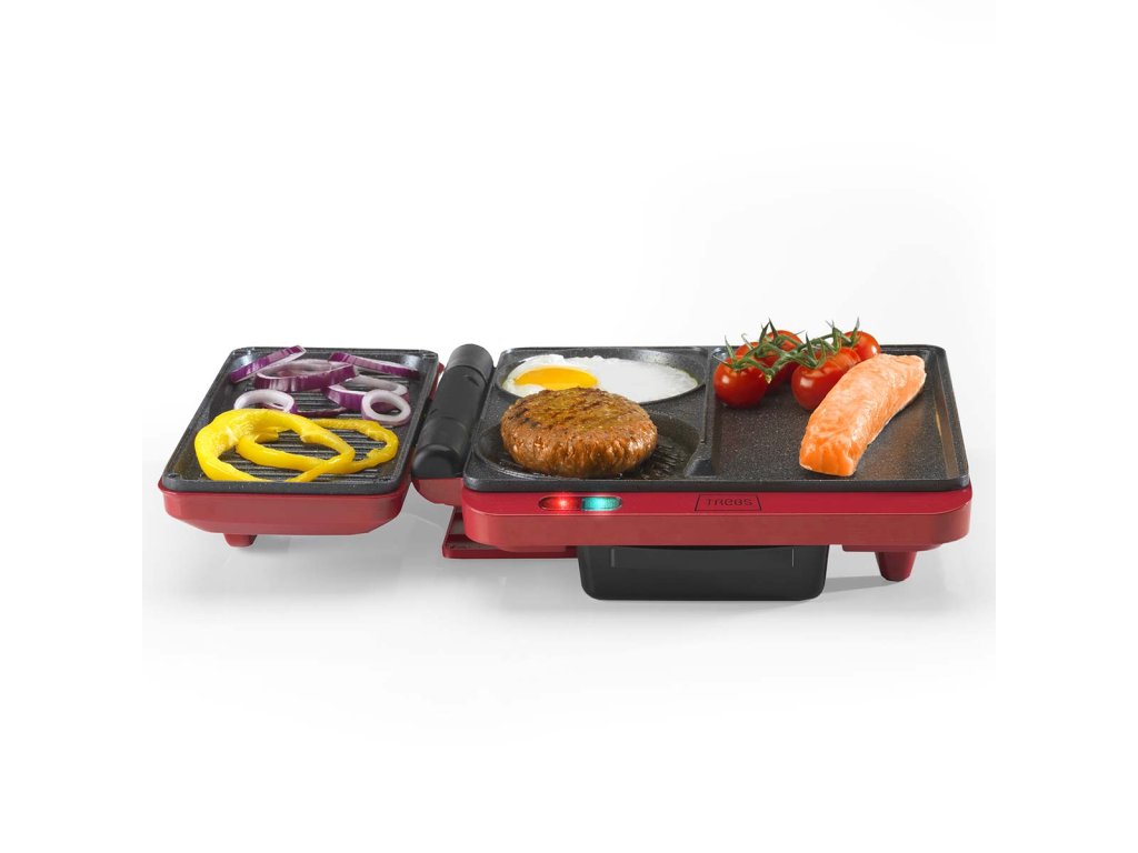 Smažení vajíčka při přípravě palačinky. Grilování sendviče a smažení hamburgeru. To je možné s kontaktním a stolním multifunkčním grilem Trebs 99362 Comfortcook. Kontaktní a stolní gril Trebs Multi Grill 99362 Comfortcook je kontaktní a stolní gril v jednom pro přípravu masa, ryb, zeleniny, palačinek nebo sendvičů. Můžete pokračovat v nekonečné variaci. Kontaktní a stolní gril Trebs Multi Grill 99362 Comfortcook je vybaven plochou deskou teppanyaki a grilovací částí s drážkami. Ale také samostatným kruhem, který je ideální pro smažení palačinek nebo vajec. Můžete se rozhodnout grilovací část zavřít a připravovat opečené sendviče a panini, ale víko otočné o 180 stupňů lze na stole umístit i otevřené, takže můžete grilovat nebo dokonce opékat. Na desce je místo, kam si každý může umístit svůj vlastní zeleninový špíz nebo satay tyčinku. Nebo si můžete rovnoměrně ugrilovat hamburger z obou stran tak, že ho umístíte mezi grilovací desky a zavřete víko. Grilovací desky jsou opatřeny nepřilnavým povrchem. Díky tomu je čištění snadné. Teplotu si můžete nastavit sami. Kontaktní a stolní multifunkční gril Trebs 99362 Comfortcook je na boku grilu vybaven odnímatelnou vaničkou na odkapávání tuku, takže přebytečný tuk z masa odkapává do ní a nezůstává na grilu.
