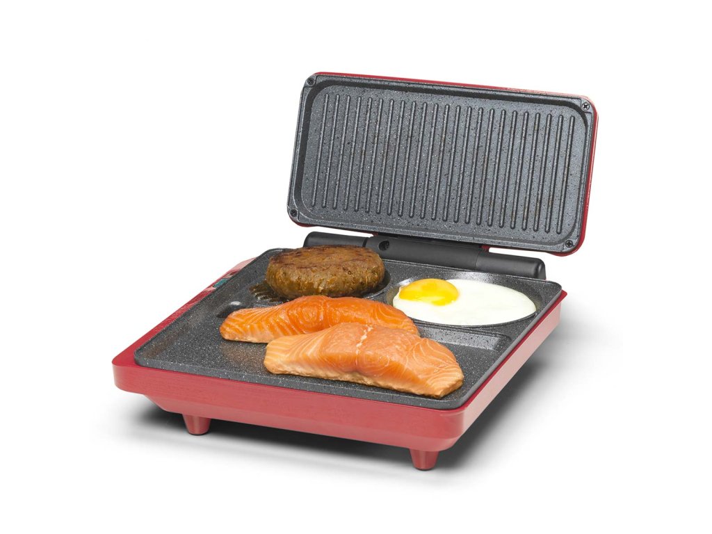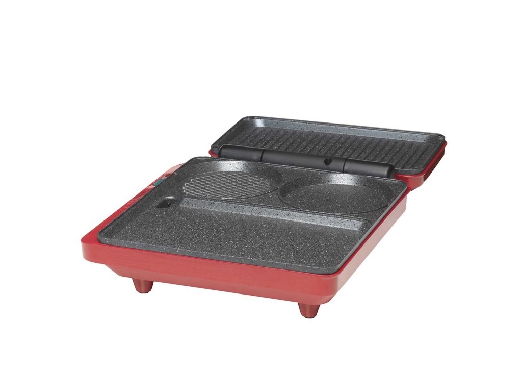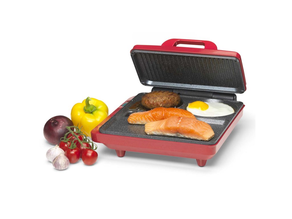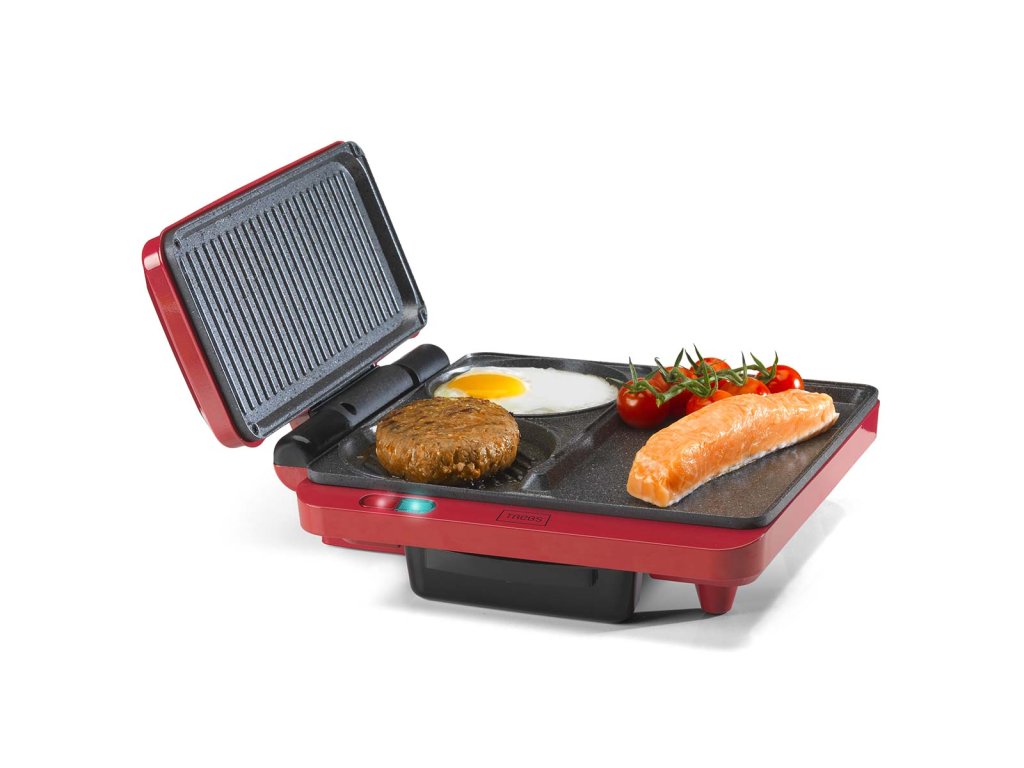 Smažení vajíčka při přípravě palačinky. Grilování sendviče a smažení hamburgeru. To je možné s kontaktním a stolním multifunkčním grilem Trebs 99362 Comfortcook. Kontaktní a stolní gril Trebs Multi Grill 99362 Comfortcook je kontaktní a stolní gril v jednom pro přípravu masa, ryb, zeleniny, palačinek nebo sendvičů. Můžete pokračovat v nekonečné variaci. Kontaktní a stolní gril Trebs Multi Grill 99362 Comfortcook je vybaven plochou deskou teppanyaki a grilovací částí s drážkami. Ale také samostatným kruhem, který je ideální pro smažení palačinek nebo vajec. Můžete se rozhodnout grilovací část zavřít a připravovat opečené sendviče a panini, ale víko otočné o 180 stupňů lze na stole umístit i otevřené, takže můžete grilovat nebo dokonce opékat. Na desce je místo, kam si každý může umístit svůj vlastní zeleninový špíz nebo satay tyčinku. Nebo si můžete rovnoměrně ugrilovat hamburger z obou stran tak, že ho umístíte mezi grilovací desky a zavřete víko. Grilovací desky jsou opatřeny nepřilnavým povrchem. Díky tomu je čištění snadné. Teplotu si můžete nastavit sami. Kontaktní a stolní multifunkční gril Trebs 99362 Comfortcook je na boku grilu vybaven odnímatelnou vaničkou na odkapávání tuku, takže přebytečný tuk z masa odkapává do ní a nezůstává na grilu.