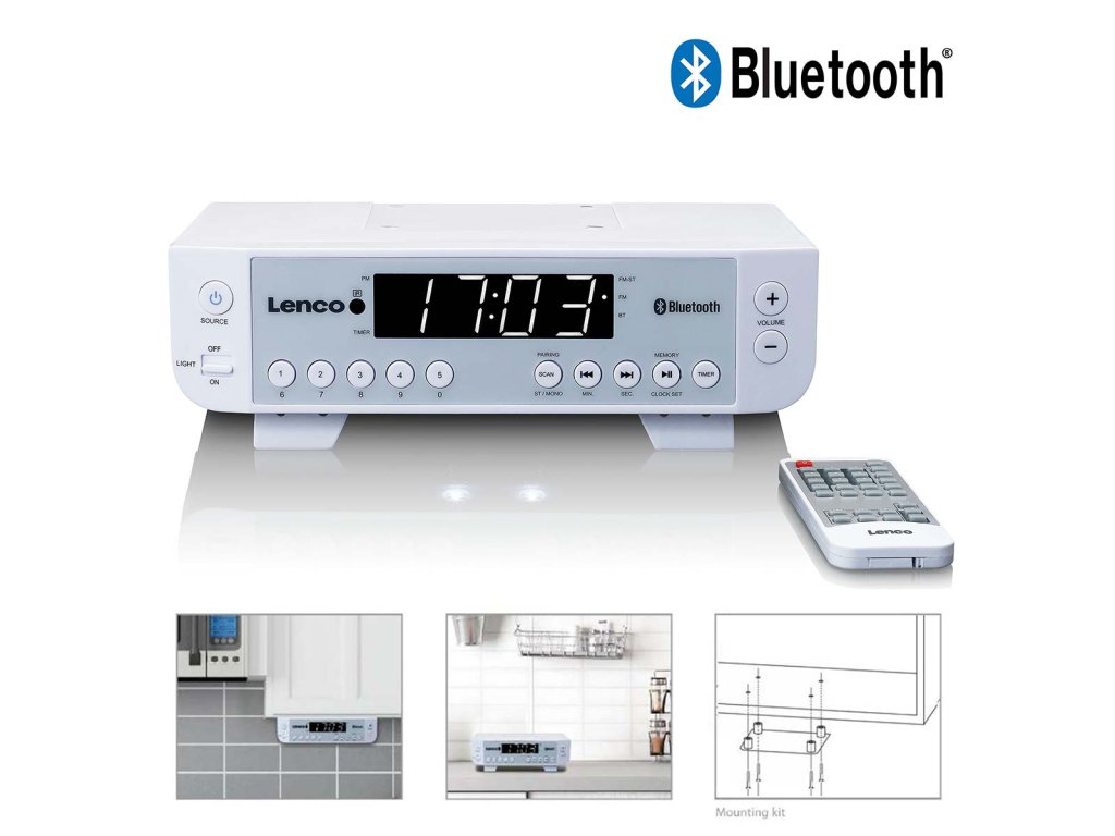 Lenco KCR-100 je kompaktní kuchyňské rádio FM pro domácí použití. Toto rádio má hladký, elegantní design s přehlednými tlačítky a jasným 0,9palcovým displejem s LED osvětlením, rádio se snadno používá. Máte oblíbenou rozhlasovou stanici? Nebo rádi posloucháte různé stanice? Na radiopřijímači Lenco KCR-100 si můžete nastavit pět předvoleb, takže už nikdy nebudete muset donekonečna hledat ten správný vysílač. Lehněte si na pohovku a ovládejte rádio pomocí dálkového ovladače, tak užitečné! Lenco KCR-100 má 2 vestavěné reproduktory, takže kvalita vaší oblíbené rozhlasové stanice je proto zaručena. Lenco KCR-100 však nabízí více než jen rádio. Díky Bluetooth® můžete také bezdrátově streamovat hudbu z telefonu nebo tabletu, a tak si můžete kdykoli poslechnout hudbu, kterou chcete slyšet. Radiobudík Lenco KCR-100 doplňují hodiny včetně časovače. Součástí balení je montážní sada, síťový adaptér a dálkové ovládání.