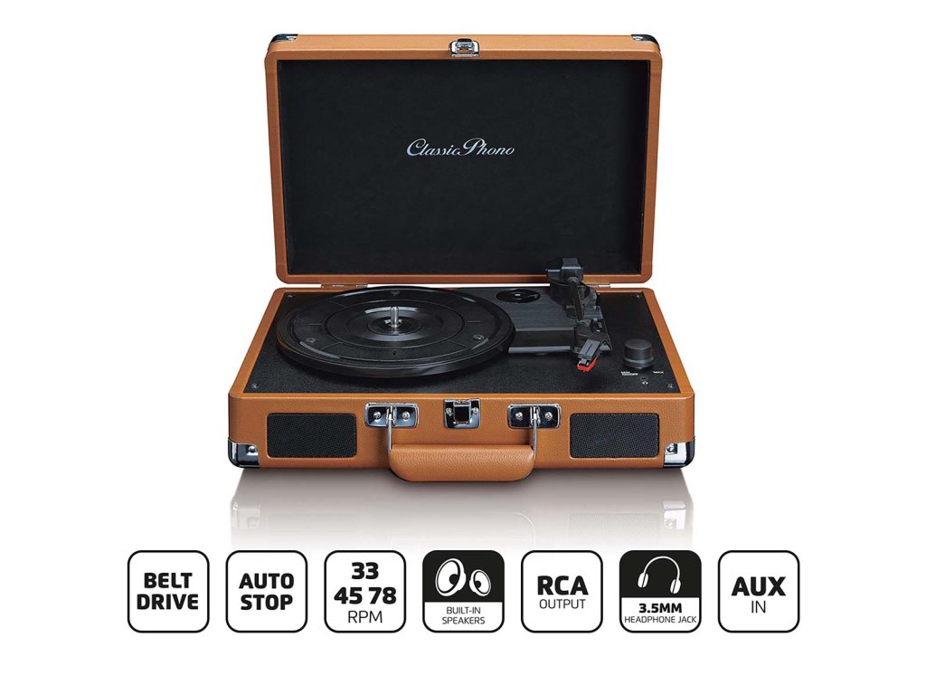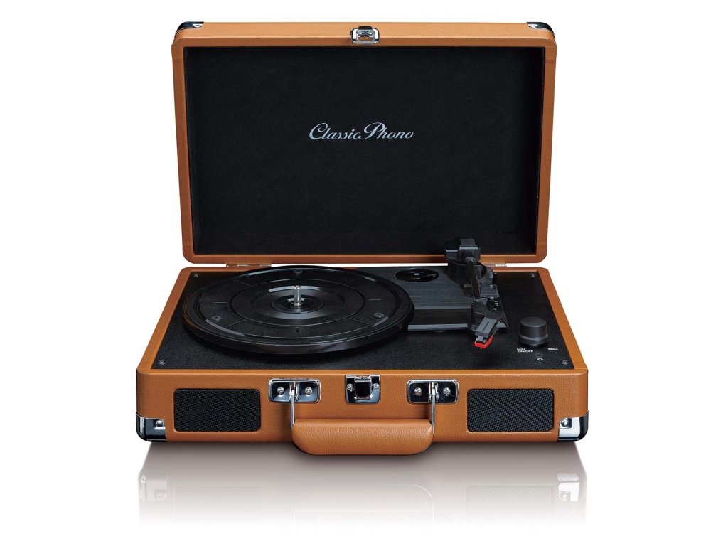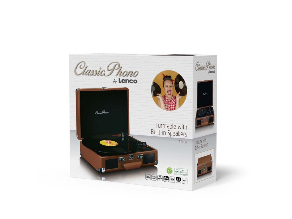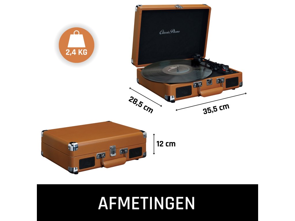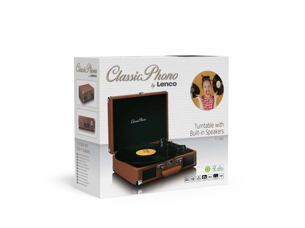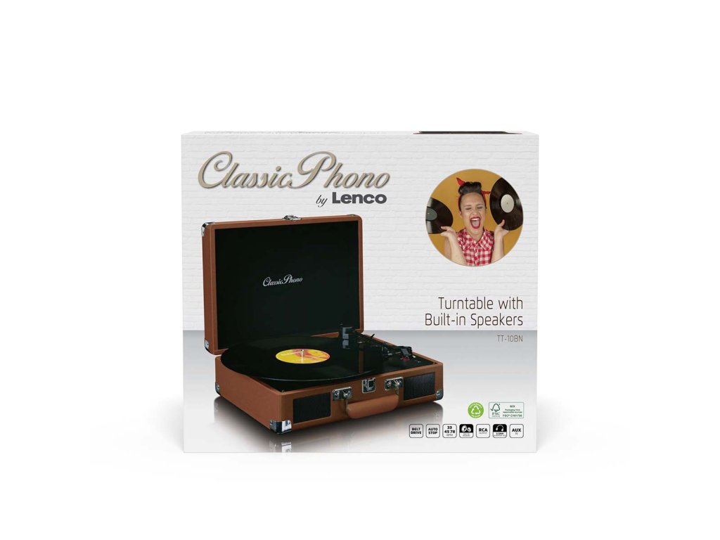 Classic Phono TT-10BN je krásný a stylový gramofon s opravdovým retro vzhledem. Gramofon je zabalen v praktickém hnědém kufříku o hmotnosti necelých 2,5 kg, takže si jej můžete vzít kamkoli s sebou. S gramofonem TT-10BN budete mít svou oblíbenou hudbu vždy po ruce, ať už půjdete kamkoli. Gramofon je uživatelsky přívětivé zařízení bez jakýchkoli zvonků a píšťalek. Díky vestavěným reproduktorům můžete přehrávat svou oblíbenou hudbu ve vysoké kvalitě. Vezměte si kufr s sebou na narozeniny nebo sraz a ohromte všechny nespočtem starých i nových hitů. Předem se zeptejte, zda si vaši přátelé a rodina také přinesou svou oblíbenou desku, a bude to nezapomenutelný večírek. Přehrávač Classic Phono TT-10BN je vybaven keramickou stereofonní kazetou s jehlou. Své desky můžete přehrávat třemi rychlostmi: 33 RPM, 45 RPM a 78 RPM. Gramofon je vybaven řemínkovým pohonem, 2 vestavěnými reproduktory, vstupem AUX, RCA a linkovým vstupem pro externí reproduktory nebo jiné zařízení.