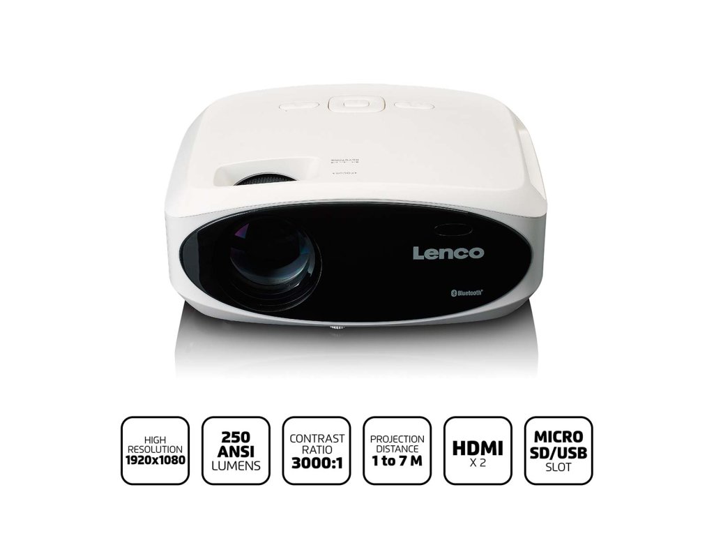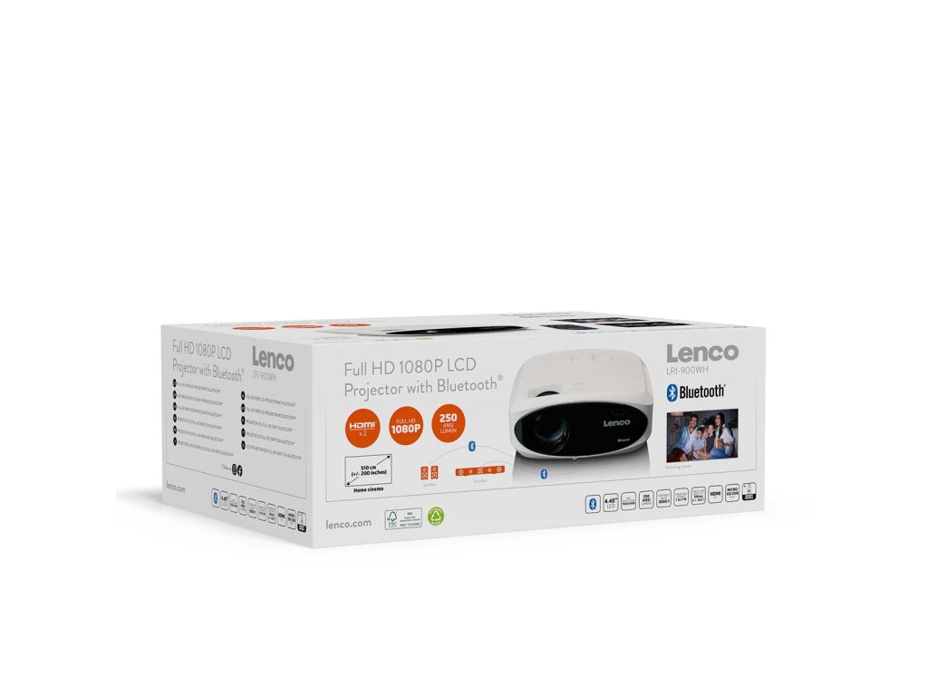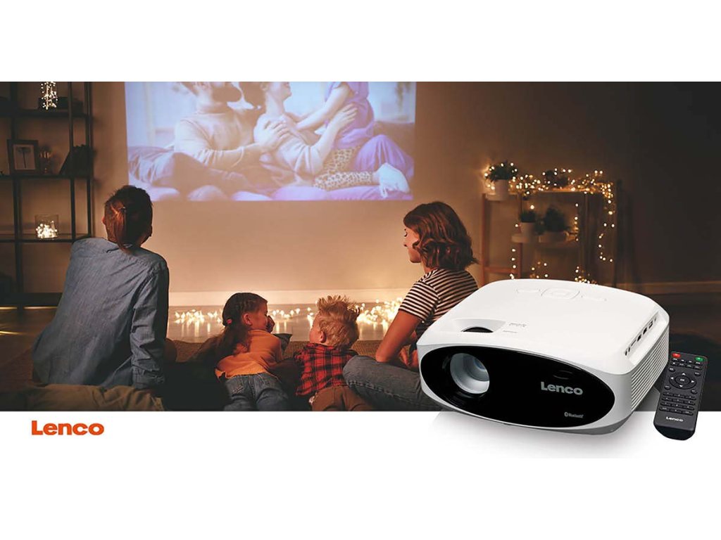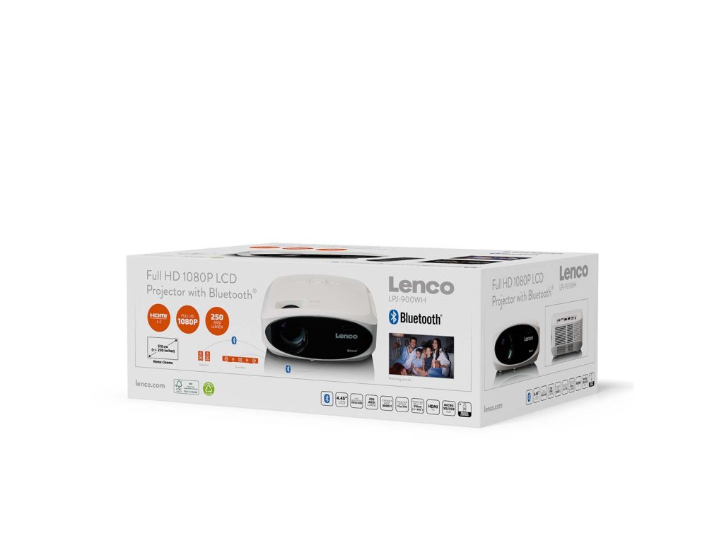 LCD projektor Lenco LPJ-900WH vám umožní ostře promítat všechny filmy, hry a prezentace. Projektor se snadno přenáší a používá. Zapněte jej, nastavte ostrost/výšku a můžete jej začít používat. Díky vestavěným stereofonním reproduktorům máte jistotu kvalitního zvuku. Beamer je vybaven rozhraním Bluetooth®, takže zvuk filmu můžete bezdrátově poslat do externího soundbaru nebo reproduktoru Bluetooth®. LPJ-900 má také obvyklé audio a video vstupy, jako jsou HDMI, USB a SD. Klíčové funkce • Výkonný FullHD projektor s rozlišením 1 920 x 1 080 (1080P). • Ideální pro hry, filmy a prezentace. • Bluetooth® 5.0 pro streamování zvuku • Snadné použití a ovládání (dálkové ovládání) • Vynikající kvalita obrazu (světelný výkon 250 ANSI lumenů) • Téměř nekonečné potěšení ze sledování, protože lampa LED vydrží v průměru 50 000 hodin svícení • Díky kompaktnímu designu jej lze umístit kamkoli Streamování pomocí Bluetooth® 5.0 Bluetooth® 5.0 je dvakrát rychlejší než jeho předchůdce Bluetooth® 4.2. Zařízení s Bluetooth® 5 se rychleji připojuje k jiným zařízením Bluetooth® a rychleji přenáší data. Streamujete hudbu nebo obrázky? Pak téměř nezaznamenáte žádné zpoždění. Pro dokonalý zážitek z poslechu jednoduše streamujte zvuk bezdrátově a přímo z projektoru do stereofonního systému, soundbaru, sluchátek nebo přenosných reproduktorů. Případně můžete použít vlastní stereofonní reproduktory projektoru LPJ-900. Zážitek jako v kině S projektorem Lenco LPJ-900 proměníte svůj obývací pokoj ve skutečné kino. Díky jasu 250 ANSI lumenů a kontrastnímu poměru 1 000:1 zažijete vynikající a čistou kvalitu obrazu. Je ideální pro případ, že budete streamovat televizi, filmy, seriály z Netflixu nebo hry prostřednictvím hardwarového klíče Cast (např. Chromecast) a.. Tento projektor má projekční vzdálenost 1 až 7 metrů pro co nejoptimálnější obraz. Maximální velikost projekce tohoto zařízení je navíc 510 cm. Vše, co potřebujete pro vlastní domácí kino. Snadné použití Lenco LPJ-700 je kompaktní a lze jej umístit kamkoli. Použití tohoto projektoru je rychlé a efektivní. Kromě připojení Bluetooth® má projektor mnoho možností připojení, například 2 porty HDMI, 1 port USB, 1 slot pro kartu Micro-SD a 1 AV. Dálkové ovládání, které je součástí dodávky, doplňuje model LPJ-900.