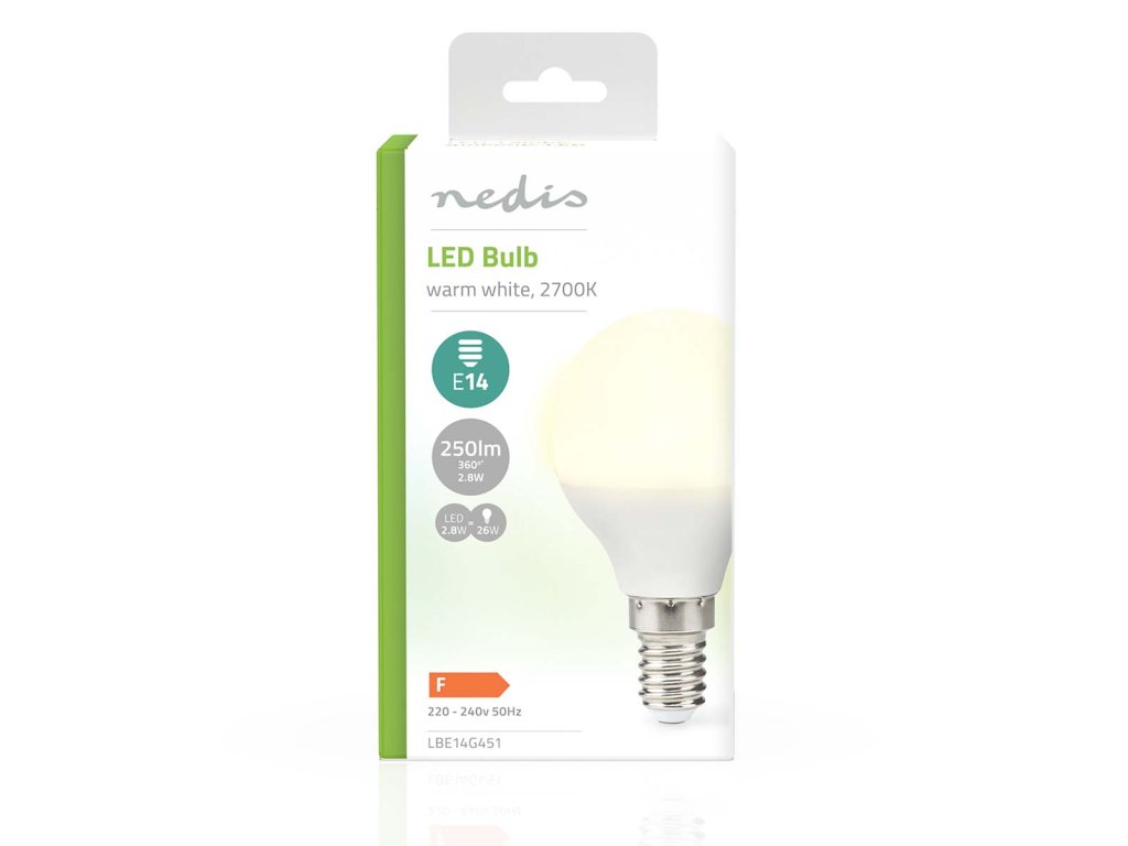 LED žárovka ve tvaru G45 s paticí E14, světelným tokem 250 lm a nízkou spotřebou energie 2,8 W nahrazuje tradiční 26 W žárovku. Tato energeticky úsporná LED žárovka vyzařuje teplé bílé světlo o barevné teplotě 2 700 K