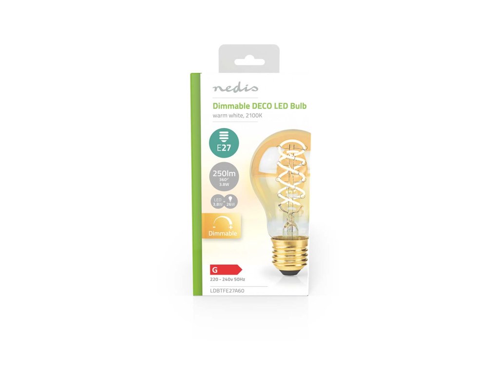 A60 shaped Decorative LED BULB with E27 cap with 250 lumen and a low power consumption of 3,8W to replace a traditional 26W incandescent lamp. This energy efficient LED bulb spreads extra warm white light with a colour temperature of 2100 Kelvin. This Bulb can be dimmed to create the right atmosphere