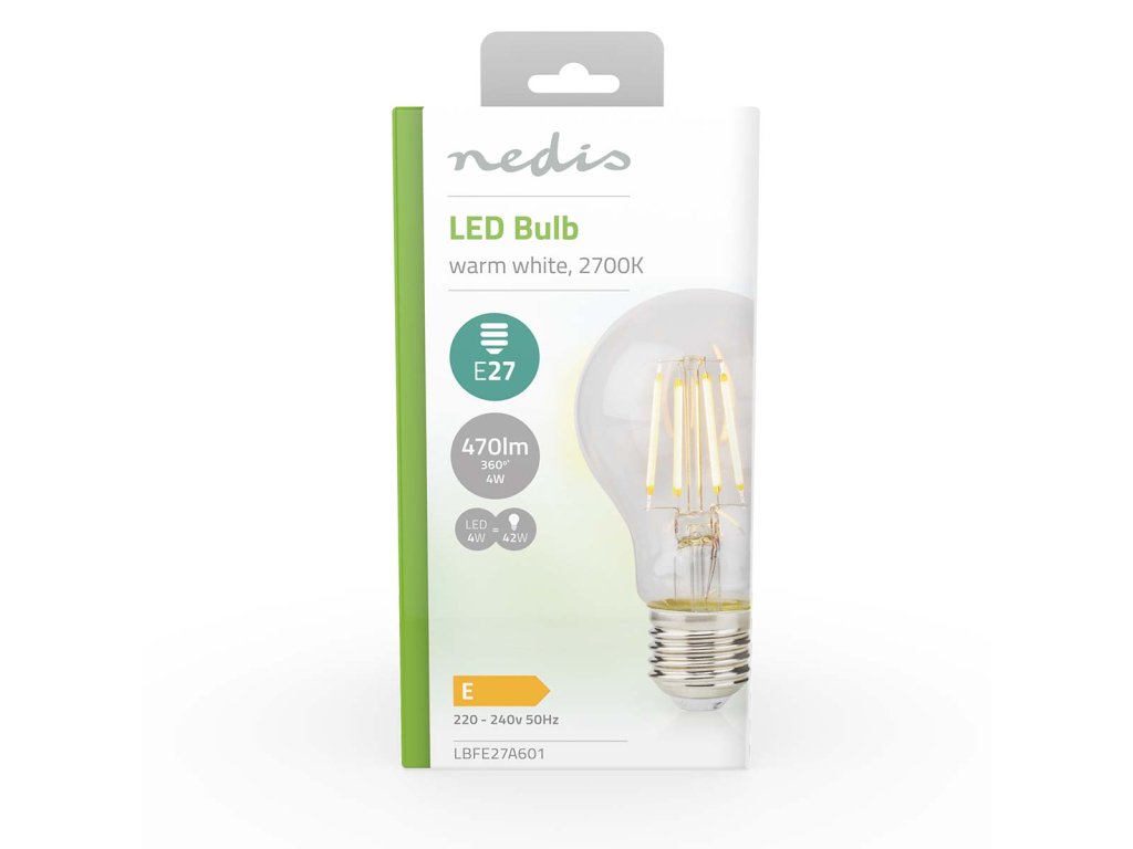 LED žárovka s vláknem ve tvaru A60 s paticí E27, světelným tokem 470 lm a nízkou spotřebou energie 4 W nahrazuje tradiční 42 W žárovku. Tato energeticky úsporná LED žárovka vyzařuje teplé bílé světlo o barevné teplotě 2 700 K