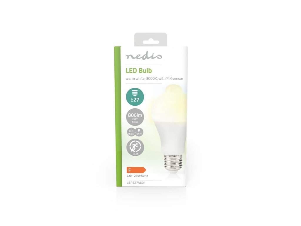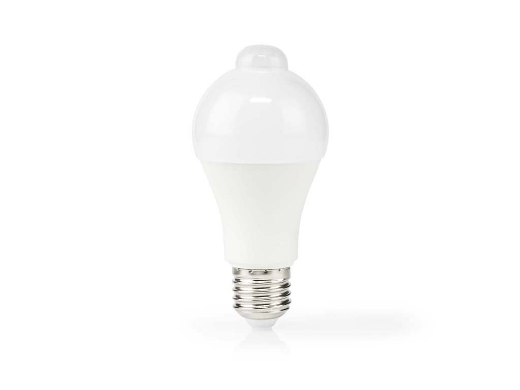 A60 shaped PIR Sensor LED BULB with E27 cap with 806 lumen and a low power consumption of 8,5W to replace a traditional 64W incandescent lamp. This energy efficient LED bulb automatically switches on when it detects movement and spreads light with a colour temperature of 3000K