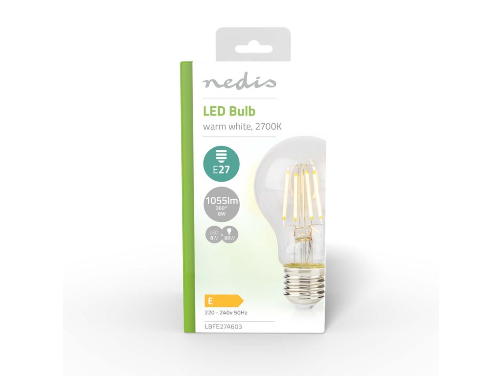 A60 shaped LED Filament BULB with E27 cap with 1055 lumen and a low power consumption of 8W to replace a traditional 80W incandescent lamp. This energy efficient LED bulb spreads a warm white light with a colour temperature of 2700 Kelvin