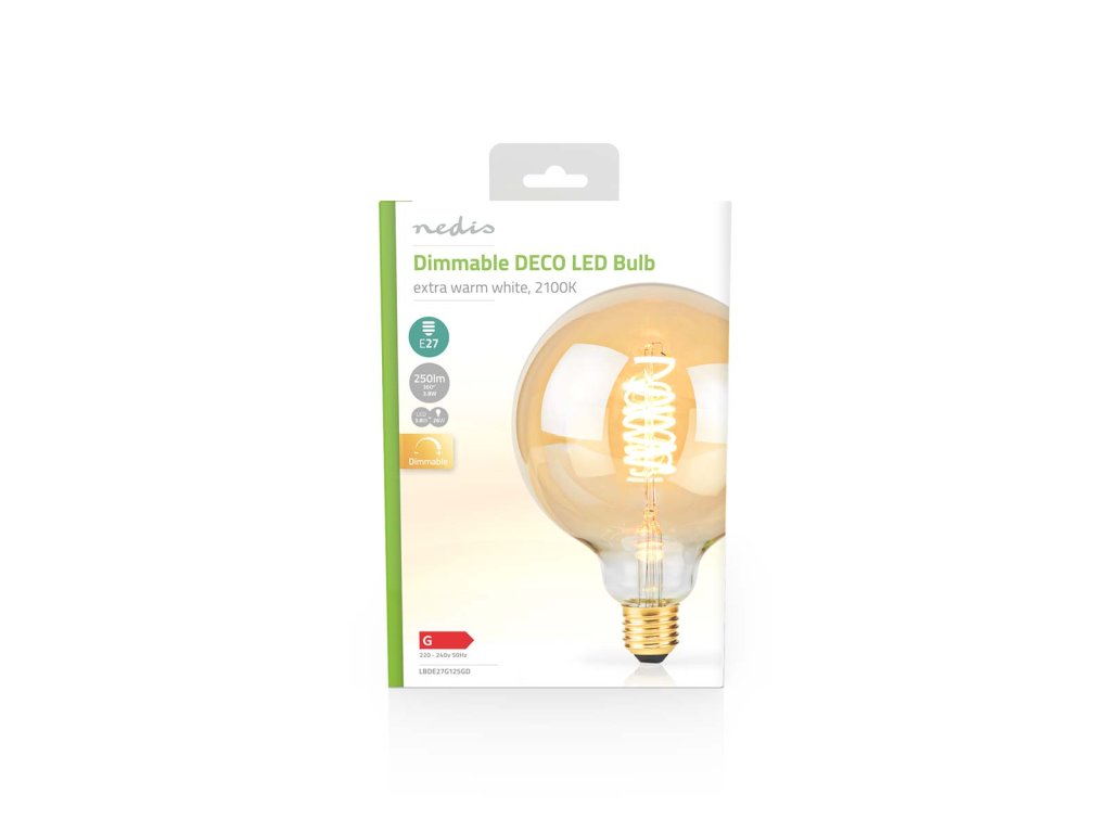 Dekorativní LED žárovka ve tvaru G125 s paticí E27, světelným tokem 250 lm a nízkou spotřebou energie 3,8 W nahrazuje tradiční 26 W žárovku. Tato energeticky úsporná LED žárovka vyzařuje extra teplé bílé světlo o barevné teplotě 2 100 K. Tuto žárovku lze ztlumit a navodit správnou atmosféru