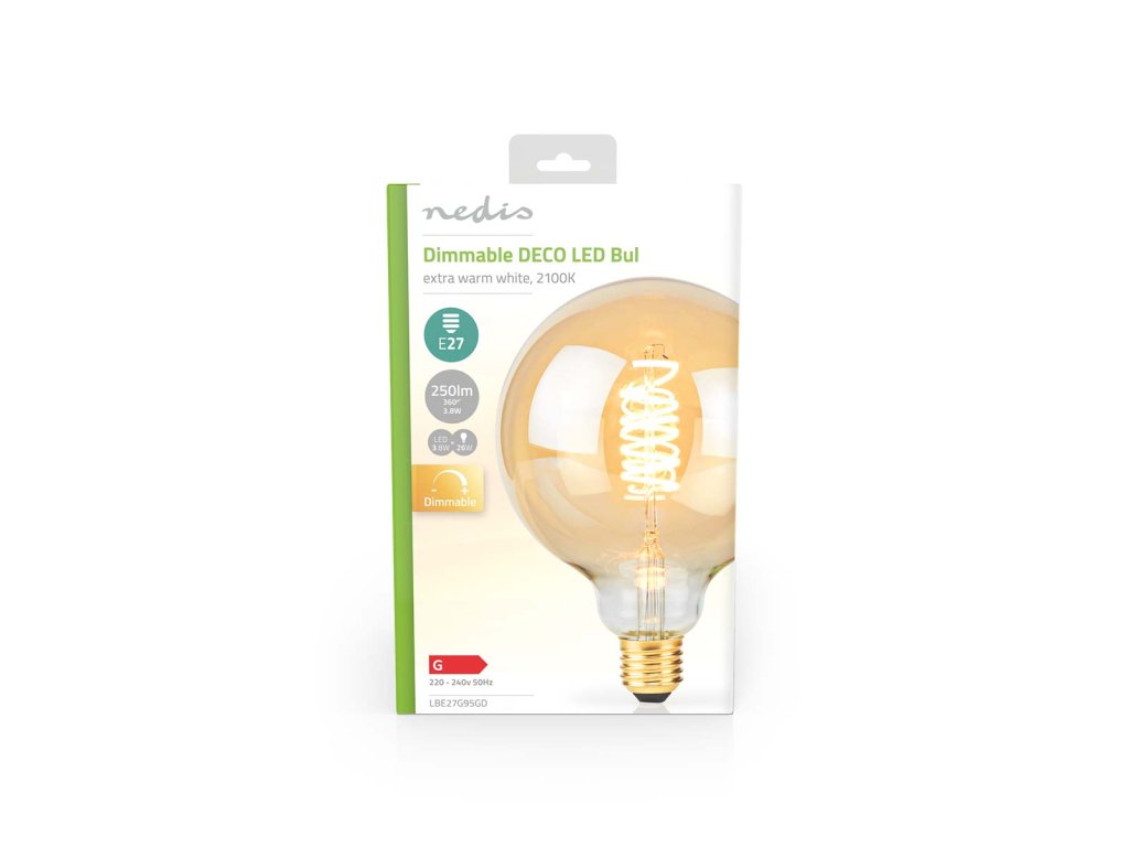 G95 shaped Decorative LED BULB with E27 cap with 250 lumen and a low power consumption of 3,8W to replace a traditional 26W incandescent lamp. This energy efficient LED bulb spreads extra warm white light with a colour temperature of 2100 Kelvin. This Bulb can be dimmed to create the right atmosphere