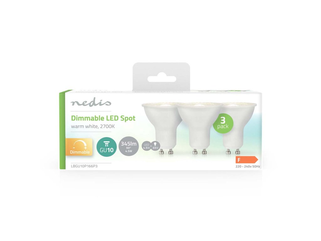 Bodová LED žárovka ve tvaru PAR16 s paticí GU10, světelným tokem 345 lm a nízkou spotřebou energie 4,5 W nahrazuje tradiční 33 W žárovku. Tato energeticky úsporná bodová LED žárovka vyzařuje teplé bílé světlo o barevné teplotě 2 700 K. Tuto bodovou žárovku lze ztlumit a navodit správnou atmosféru