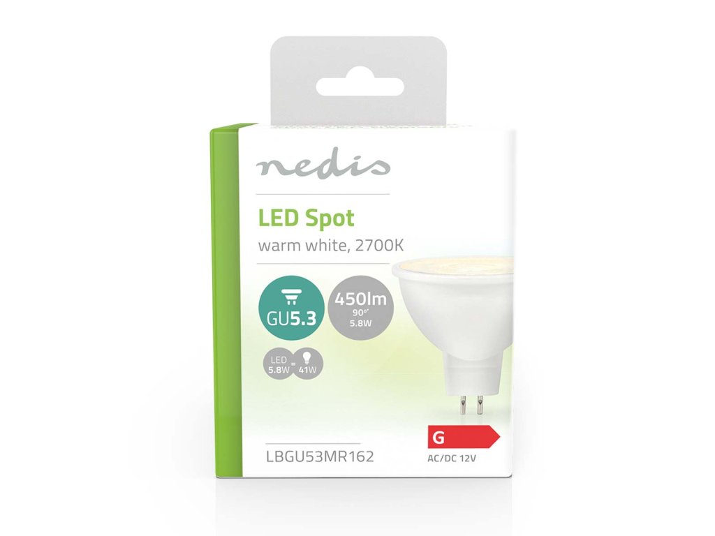 MR16 shaped LED Spot with GU5.3 cap with 450 lumen and a low power consumption of 5,8W to replace a traditional 41W incandescent lamp. This energy efficient LED Spot spreads a warm white light with a colour temperature of 2700 Kelvin