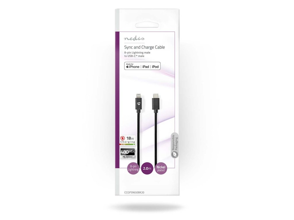 Kabel pro připojení zařízení iPhone, iPad, iPod nebo MacBook k počítači pro synchronizaci a nabíjení. Připojením k nabíječce USB-C™ můžete dobít baterii v zařízení na plnou kapacitu.
