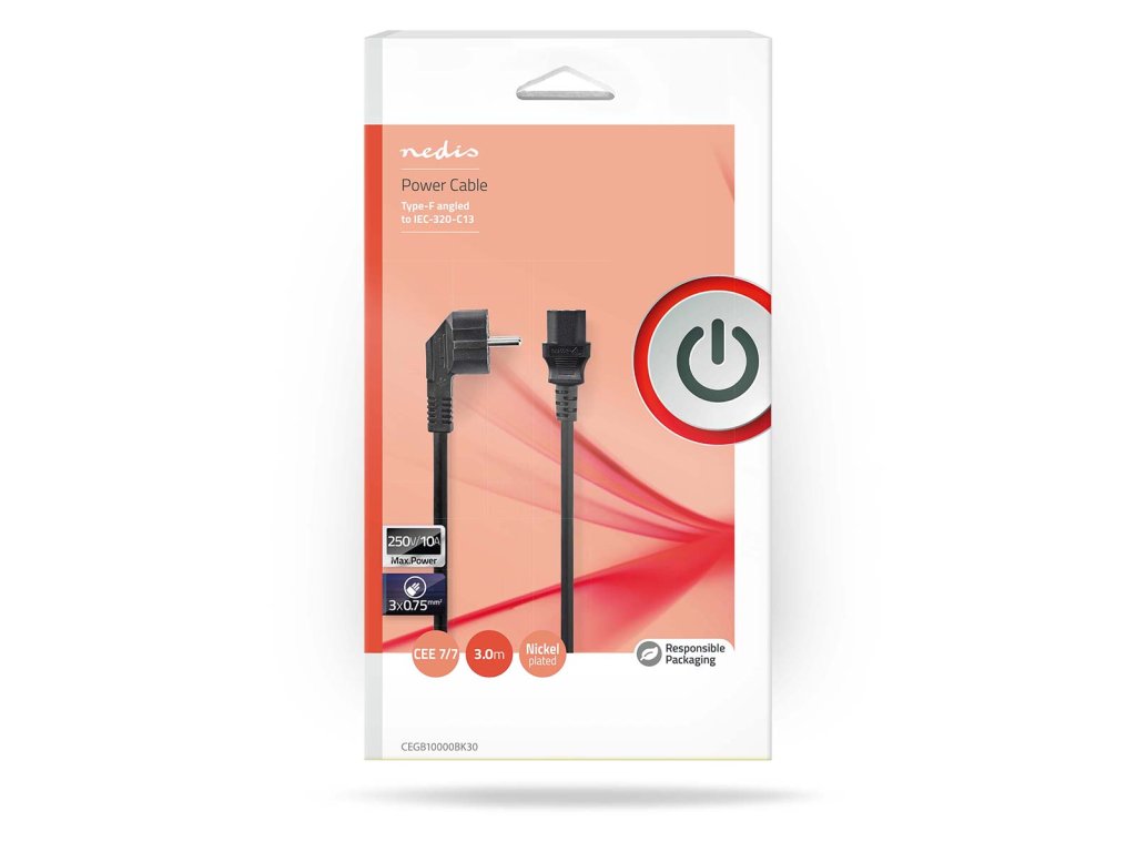Tento 10A napájecí kabel s konektorem Zásuvka Typu F je vhodný k připojení zařízení napájených ze sítě, jako jsou např. PC, do zásuvky ve zdi.