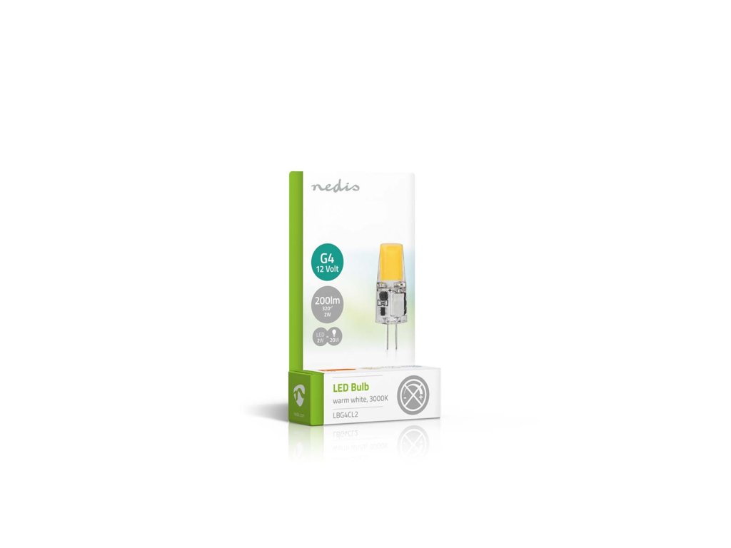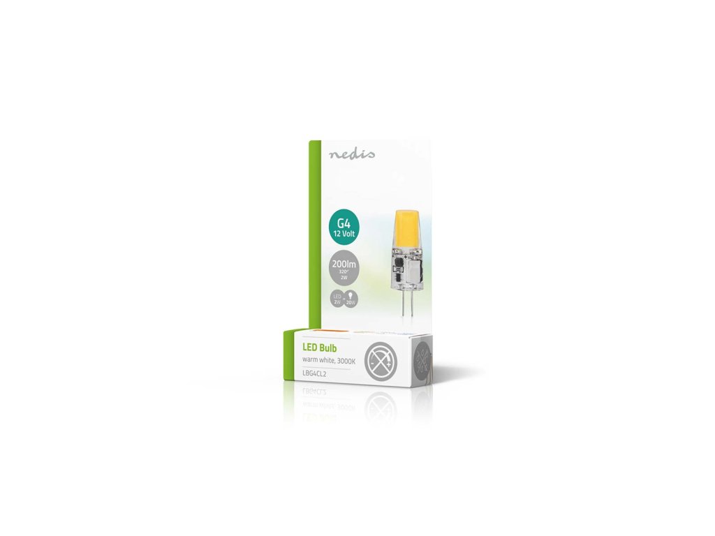 Nedis® LED žárovka 12 V s paticí G4 používá LED diody COB (Chip On Board), které jsou mnohem energeticky účinnější než klasické žárovky. Žárovka poskytuje světelný tok 200 lm, má matný kryt, který rovnoměrně rozptyluje teplé bílé světlo o barevné teplotě 3000 K a má velice nízkou spotřebu 2 W na rozdíl od klasické 20 W žárovky.