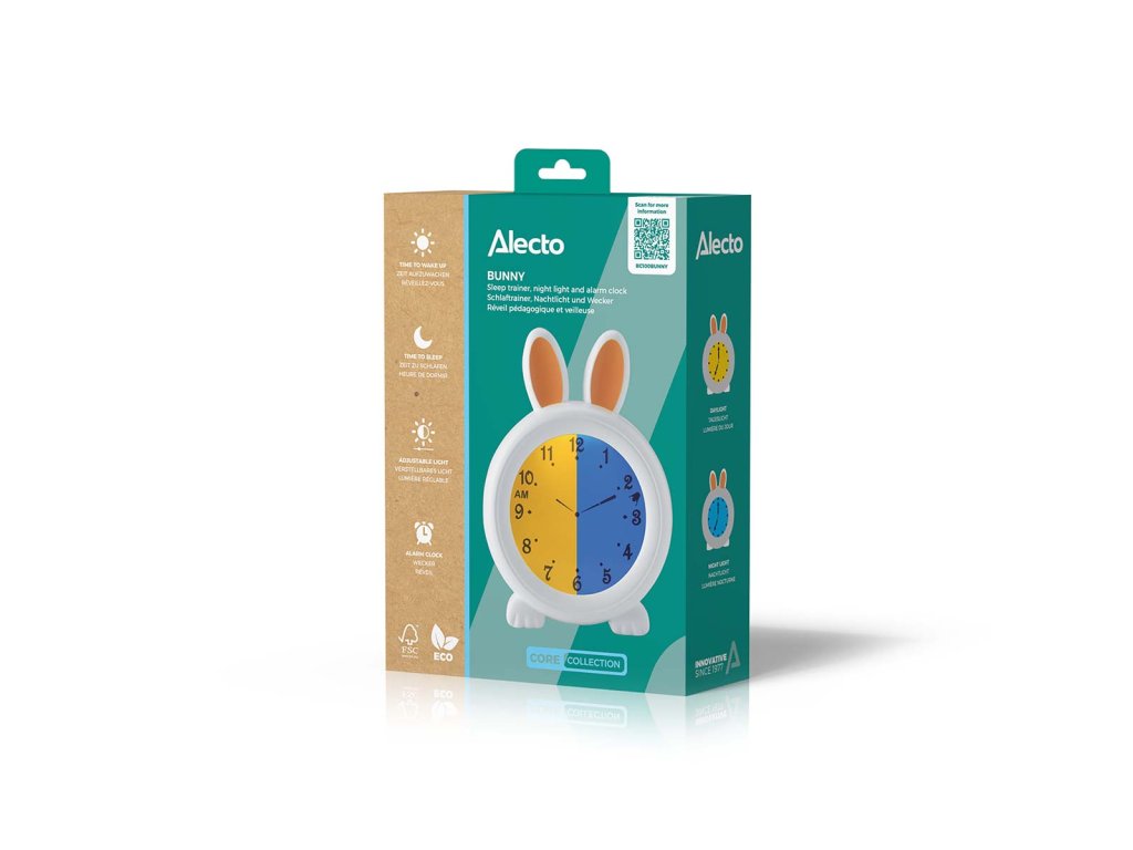 Tento trenažér spánku učí vaše dítě ve dne i v noci Někdy je pro děti obtížné odhadnout rytmus dne a noci. Probouzejí se a myslí si, že je čas vstávat, zatímco ve skutečnosti by měly ještě několik hodin zůstat v posteli. Tento problém se často ještě zvětší, když se dny prodlužují a zkracují nebo když začíná letní a zimní čas. Alecto BC100BUNNY je trenažér spánku, který dětem pomáhá rozvíjet smysl pro čas. Jak přesně takový trenažér spánku funguje Jako rodič nastavíte na trenažéru spánku Alecto BC100BUNNY čas, který je podle vás vhodný pro vstávání. Trenažér spánku umístíte do ložnice svého dítěte na místo, kde na něj dobře vidí. Displej má v noci modrou barvu. To je pro vaše dítě znamení, že by mělo zůstat v posteli. Byl dosažen čas, který jste nastavili? Pak trenažér spánku Alecto BC100BUNNY přeskočí na oranžový displej. Je čas vstávat! Tímto způsobem můžete naučit každé dítě - i když ještě neumí určit čas - aby zůstalo déle v posteli a dopřálo vám více spánku. Spánkový trenažér je bezdrátový a dobíjecí. Dodáváme kabel micro-USB, kterým jej můžete nabíjet. Jas obrazovky lze nastavit v 7 stupních. Pokud tedy chcete, můžete jej používat i jako noční světlo. V neposlední řadě je Alecto BC100BUNNY také budík s alarmem. Díky svým praktickým rozměrům (15,5 x 11,5 x 3,6 cm) jej lze snadno umístit kamkoli. Pojďme si stručně vyjmenovat všestranné možnosti spánkového trenažéru Alecto BC100BUNNY. - Trenažér spánku, pomáhá dětem získat smysl pro čas - Lze použít i jako hodiny s budíkem - Modrá obrazovka: je čas jít spát - Oranžová obrazovka: je čas vstávat - Bezdrátový a dobíjecí Trenér spánku, kterému můžete důvěřovat Trenažér spánku Alecto BC100BUNNY je výrobek společnosti Alecto Baby. Mnoho mladých rodičů důvěřuje našim výrobkům, které jim zlepšují a usnadňují každodenní život a péči o dítě (děti). Naše výrobky se v testech často umisťují na předních místech a jsme jedničkou na trhu s dětskými trenažéry. S Alecto si vybíráte promyšlený a uživatelsky přívětivý výrobek vysoké kvality.