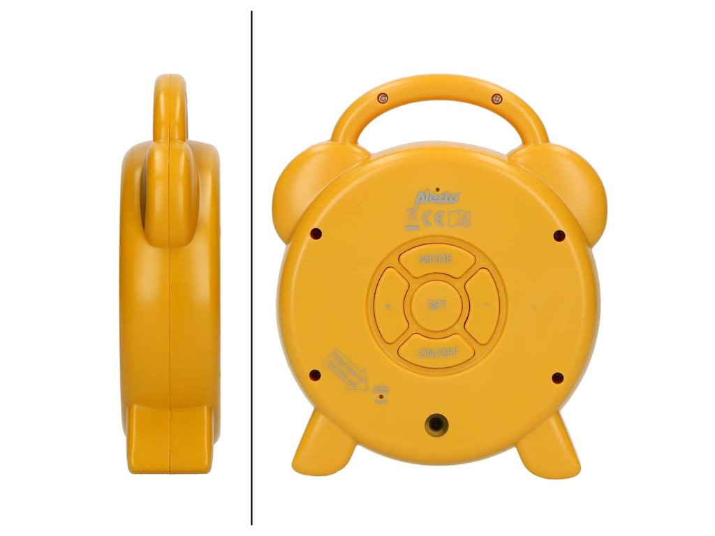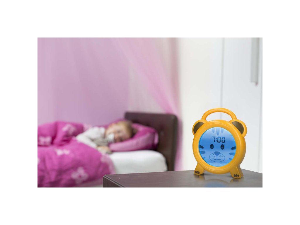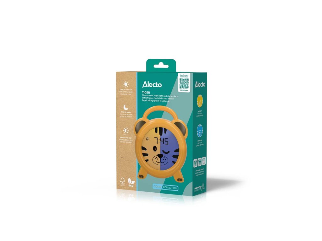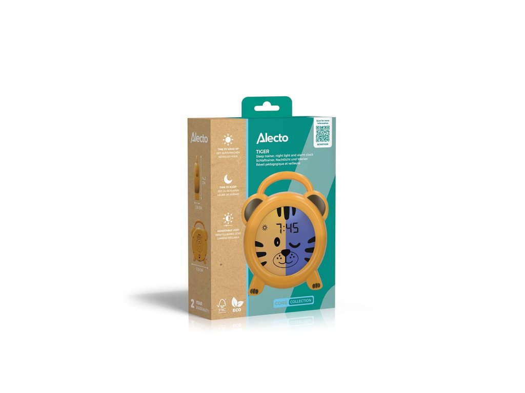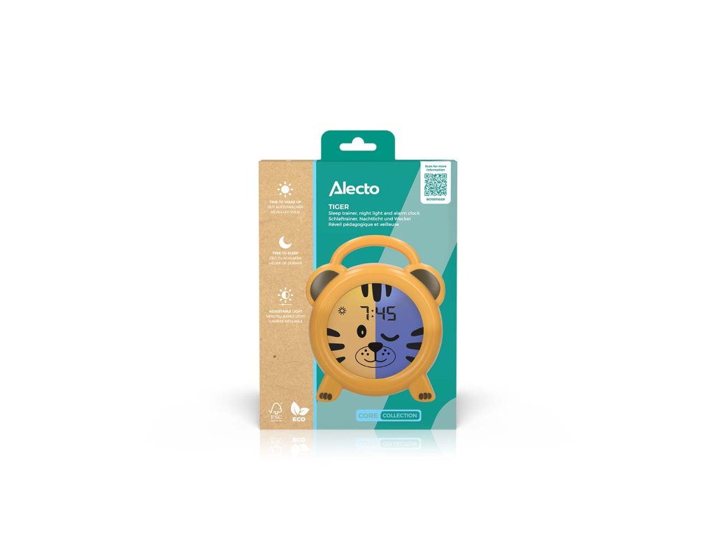 Šikovný budík s nočním světlem do dětského pokoje! Kompletní řešení pro získání přehledu o čase Trenažér spánku Alecto Baby BC100TIGER je komplexním řešením pro děti, které se hravou formou učí zacházet s časem. Spánkový rytmus je důležitým faktorem pro vývoj vašeho potomka. Tento praktický noční světelný budík zajišťuje každodenní pravidelnost, kterou děti mohou využívat po celý zbytek života. K plnému zotavení těla a mysli potřebují děti více spánku než dospělí. Často však nechápou, když si spokojeně hrají, že je čas jít spát. Aby děti získaly smysl pro (spánkový) čas, je řešením toto praktické noční světlo - budík! Trenér spánku, funkce uspávání a buzení Tento praktický noční světelný budík funguje vynalézavým způsobem. Automaticky umožňuje vašemu dítěti zvyknout si na okamžik usnutí a také na to, kdy smí vaše dítě vstát. Jako rodič jednou nastavíte čas usínání a čas vstávání. V době spánku displej zmodrá a tygřík zavře oči. Od doby buzení se displej změní na oranžový a tygřík otevře oči. Vaše dítě podle barev na hodinách okamžitě pozná, kdy je čas spánku nebo čas vstávání. I když se vaše dítě probudí příliš brzy, ví, že má ještě chvíli zůstat v posteli. To je samozřejmě velmi dobré pro noční spánek maminky a tatínka! Noční světlo Díky hravému a jednoduchému designu se hodiny hodí do každého dětského pokoje. Tento praktický noční světelný budík je bezdrátový a dobíjecí (pomocí vestavěné baterie a dodávaného kabelu USB) a lze jej používat i samostatně jako hodiny s budíkem. Displej hodin slouží také jako noční světlo a dodává vašemu dítěti pocit bezpečí.