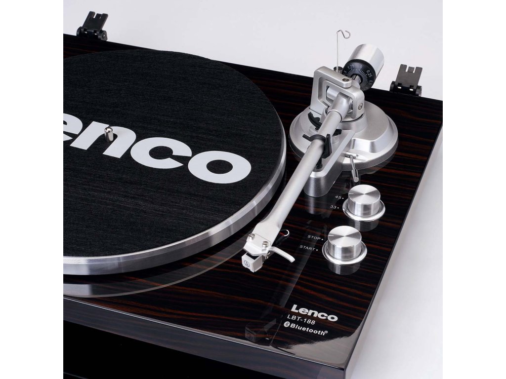 Lenco LBT-188 je gramofon s funkcí Bluetooth®. Připojení tohoto přehrávače k reproduktoru Bluetooth® nebo sluchátkům je snadné a pohodlné, což představuje ideální nastavení pro vychutnání plného hřejivého zvuku při domácím lenošení na gauči. Vyzvedněte své staré desky z půdy a přehrajte si je na tomto moderním gramofonu. Vychutnejte si křišťálově čistý zvuk svých starých i nových vinylů. Přepínejte z 33 na 45 otáček za minutu a přehrávejte vinylovou desku tou správnou rychlostí. Součástí balení je systém převodu analogového signálu na digitální, s připojením USB snadno archivujte své drahocenné vinyly do počítače pomocí portu USB na zadní straně přehrávače. LBT-188 má kovový talíř gramofonu, řemenový pohon, připojení RCA a rameno s protizávažím. Plastový kryt zajišťuje, že váš gramofon nezmizí pod vrstvou prachu, a chrání jej před jakýmkoli vnějším poškozením. Gramofon se dodává včetně CE-UK multizástrčky a síťového adaptéru.