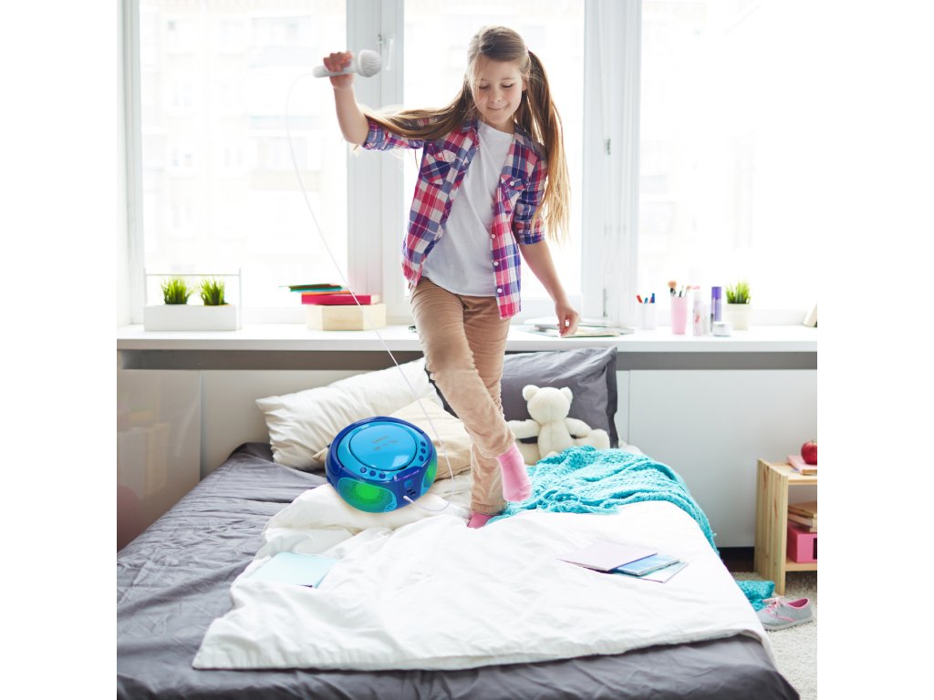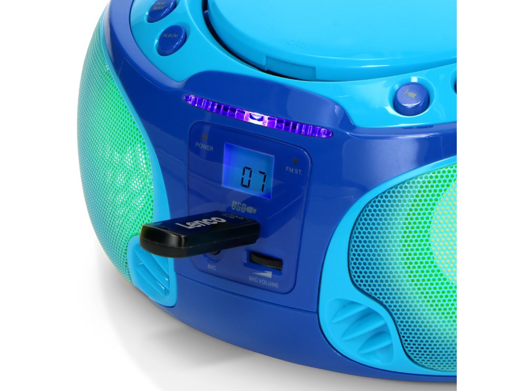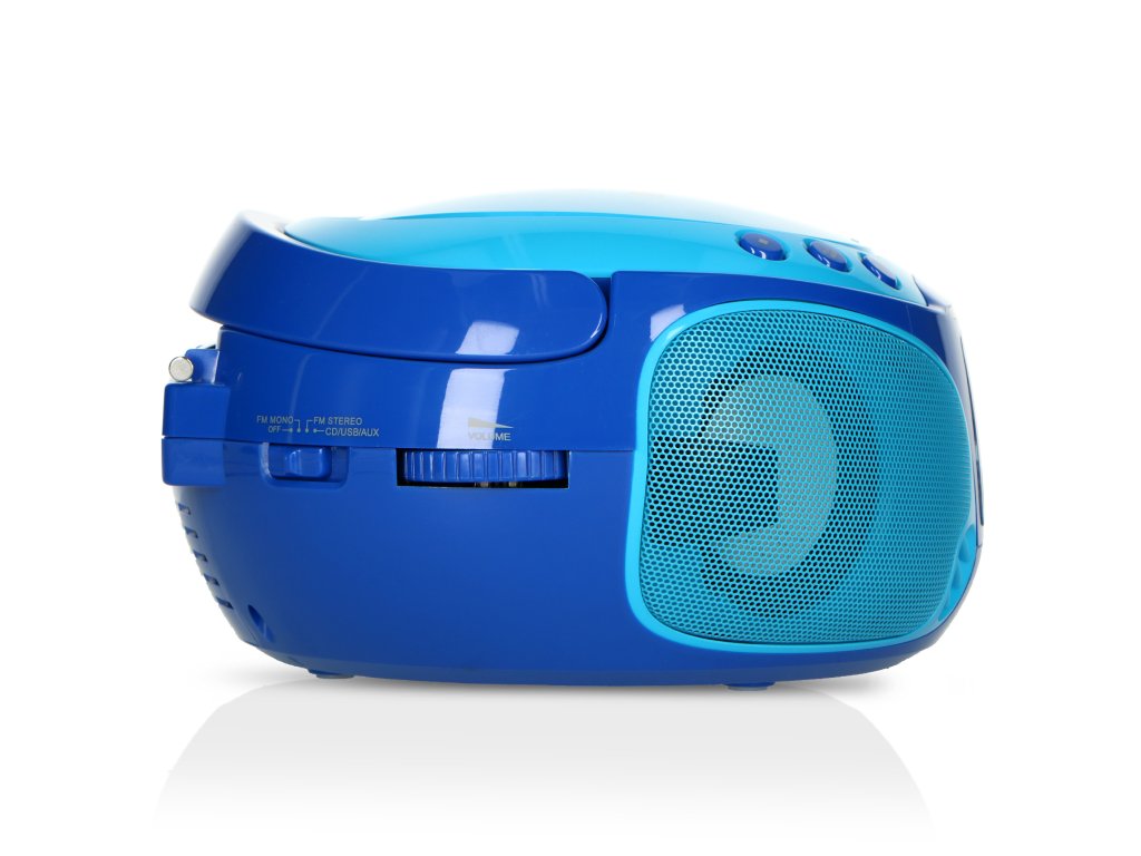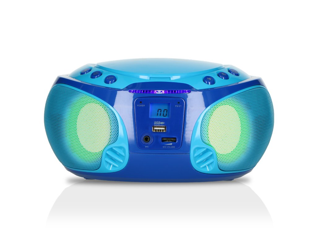 Přenosné FM rádio CD/MP3/USB Mikrofon a světelné efekty Modrá barva